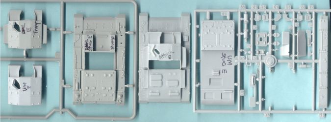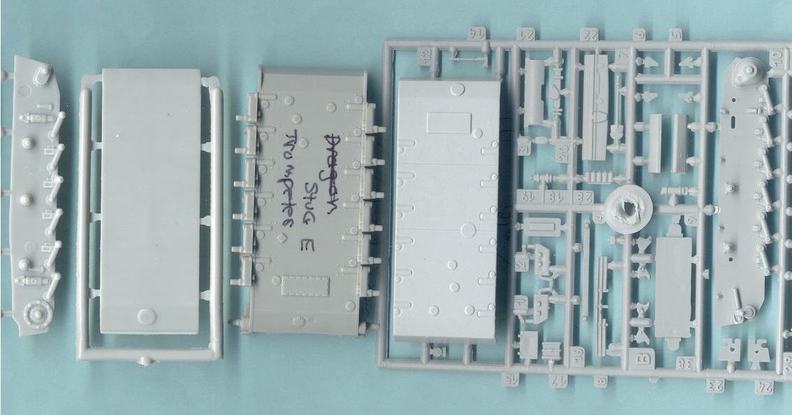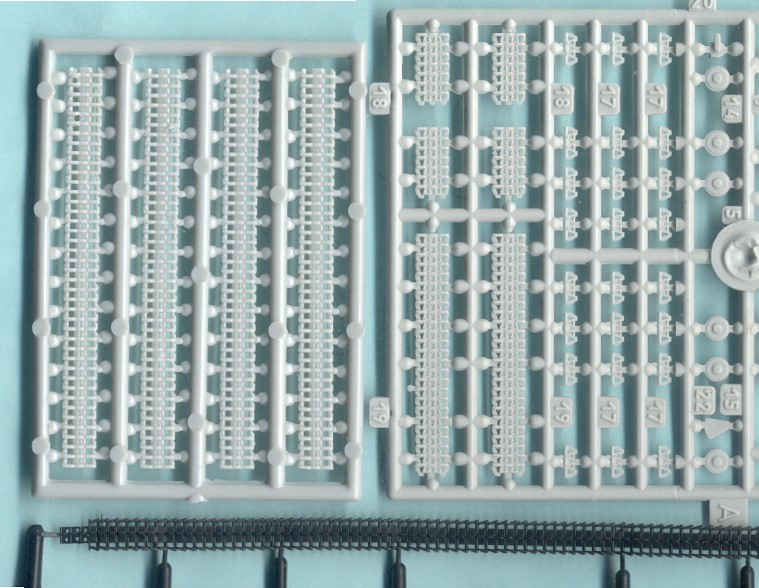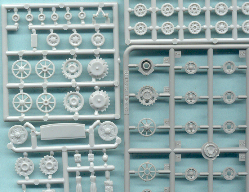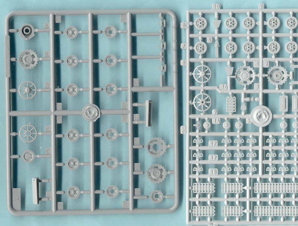 Kit Parts The Trumpeter Sturmgeschütz Ausf. E kit 7258 gives us about 71 light gray, injection molded styrene plastic parts, and two soft black plastic band tracks. The box states 80 parts; maybe Trumpeter is including the 11 individual decal markings? The Uni Models Sturmgeschütz III Ausf. E kit no. 278 has about 110 injection molded styrene plastic parts for the vehicle plus an additional 54 link & length hard styrene track parts, and 20 etched brass parts, the only small scale StuG III kit here offering etched brass parts. The Trumpeter and Attack StuG III Ausf. E models contain no etched brass or resin parts or crew figures. Next over is the upper hull for the Trumpeter kit (part-C3) which looks comparable in detail and quality to the UM upper hull part-10E. The UM upper hull right of the Attack hull has separate fenders, brake access hatches (parts-22E and 23E) and separate tools to mount on the fenders. The engraved lines denoting the engine hatches appears too wide and deep; I feel Trumpeter got it better. In the center between the two sprues is the old Attack Hobby upper hull (part-A27). The Attack model has some accuracy issues with the incorrectly shaped gunsight opening on the roof, and the raised engine vent covers on the engine deck. The gunsight hole can be enlarged easily enough. Shaving off these engine vents will be more difficult. At far right is UM's Sprue-E with a lot of small parts to judge the kit quality and molding. I am used to UM kits being molded in a dark styrene like their Sherman models; I find this pale gray color a nice change. The Trumpeter and the UM hull bottoms are pretty comparable in details. The UM kit, like the Attack kit, uses four parts to make the bottom hull while Trumpeter and Dragon do this with one large part. Looking closely at UM's sprue B at far right I find the detail very good and improved over UM's kits released years ago. For example, I appreciate how UM has molded their engine mufflers as a separate piece (parts 1B and 2B) while both Trumpeter and Dragon mold their engine mufflers on the rear armor plate with resulting loss of detail. The Uni Models wheels on sprue-A at far right look comparable in quality to the Trumpeter parts. The UM link & length track parts look particularly good but this model track type may be very tedious to remove from the sprue and fussy to work with and assemble straight. At upper right are the Uni Models StuG III and Panzer III roadwheel parts 6A and 7A which look comparable in quality here to Attack's roadwheels (parts C7 and C8). Trumpeter's roadwheels (parts A7 and A8) at lower right appear to me to be the most accurate and with the sharpest detail of the three manufacturers here. At right are the light gray hard styrene link & length plastic tracks in the UM kit. I think these tracks look great. The track teeth are done well and accurate though are solid and many German tracks have hollow track teeth. These StuG tracks should be the same as used on the Pz III, Pz IV variants. At the bottom is the long soft plastic band track from the Trumpeter StuG model. The detail is good. My past experience with these Trumpeter tracks is that they don't take Cyanoacrylate Super Glue well, so the track ends don’t stick together well and they do not adhere well to the roadwheels. I've not used these UM tracks before so cannot testify about how they fit together. My experience with link & length hard plastic track is that it is challenging to cut off all the little individual links (Parts A17) from the sprue and get them straight around the idler and sprocket wheels.