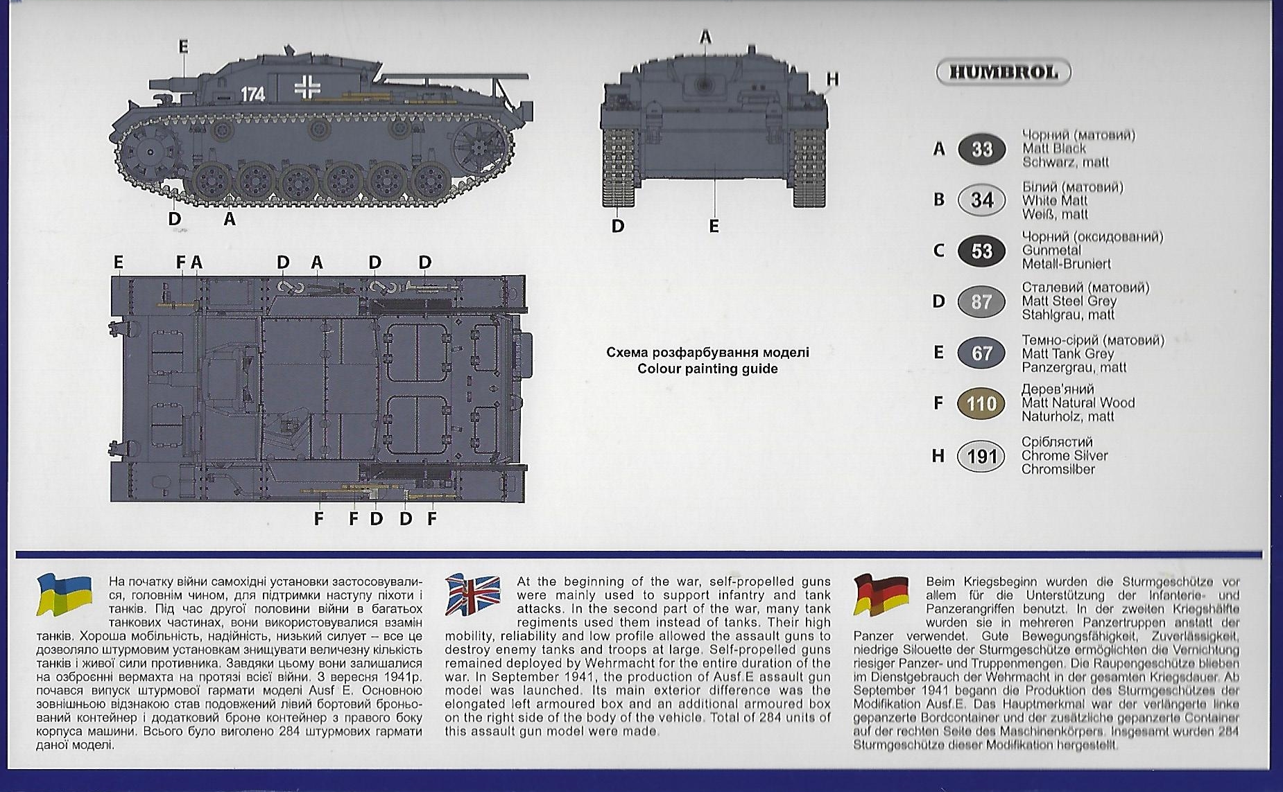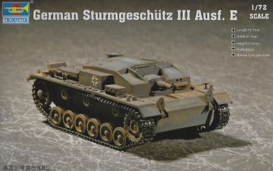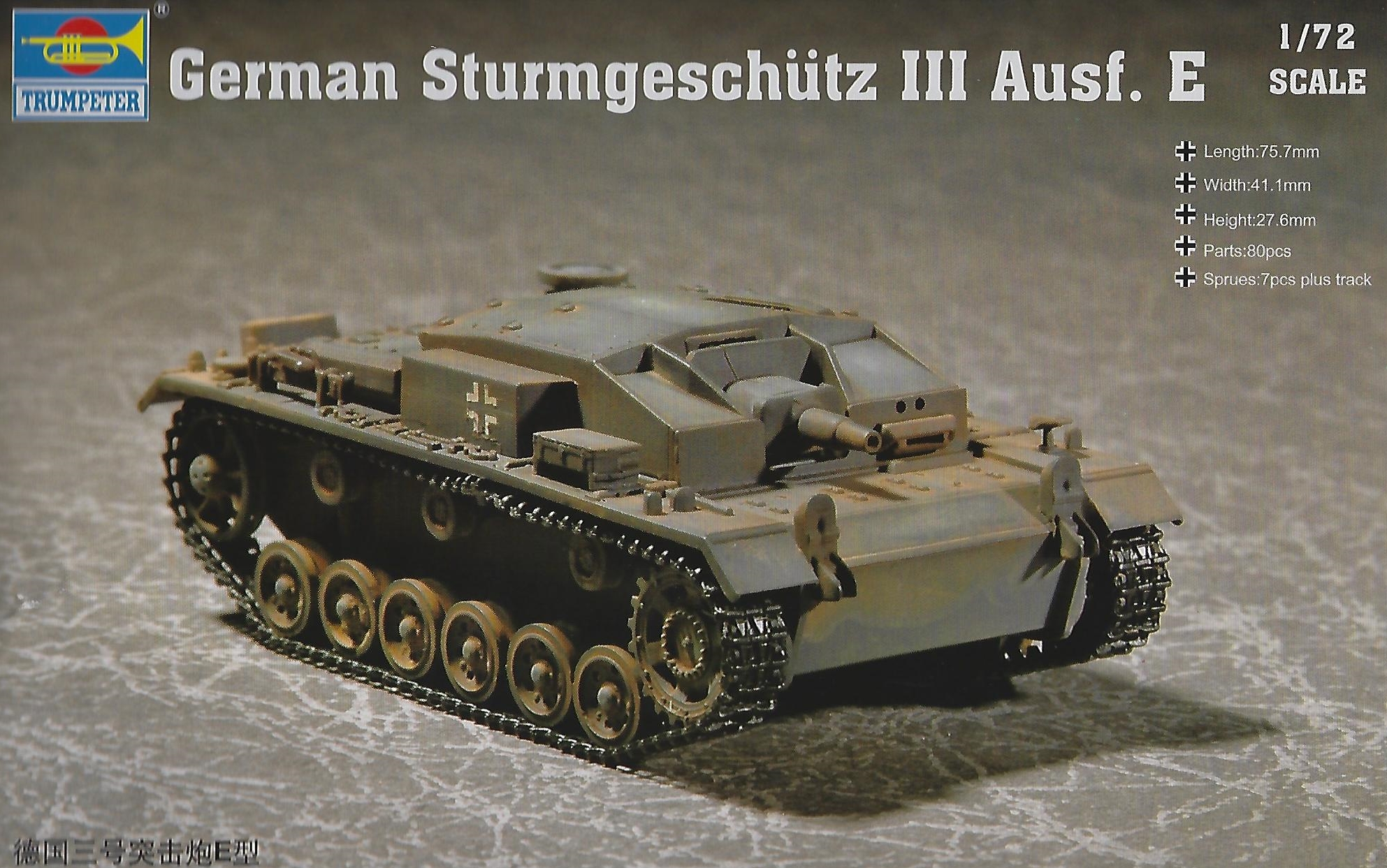 | The Trumpeter Sturmgeschütz Ausf. E kit 7258 box art displays a good view of the new box panniers of this variant and the later Ausf. F. There is still no rooftop vent that was installed in the later long gun StuG Ausf. F. On the rear port-side fender we see a spare roadwheel. The U-shape lift ring needs to be added to the side in front of the box shaped pannier. The sprocket wheel features no hubcap so we can see the bolt heads. Compare this with the Attack and UM StuG Ausf. E kits which have sprockets with hub caps. The tracks appear to be unpainted black plastic. The gun muzzle is molded open. I don't see tow cables coiled on the engine deck as shown in my reference. Be aware that on the armored headlight covers there appears to be round holes? There should be fine horizontal slits not holes in the headlight covers, I think these holes on this model are sink holes in the plastic. The vehicle appears to be finished in a monotone panzer gray color with brown dust. |