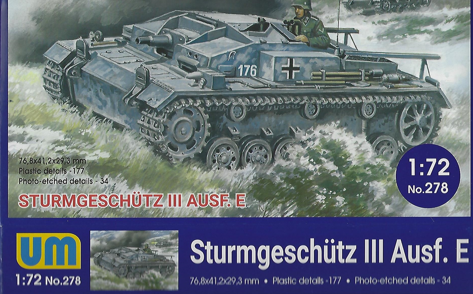 The UM Sturmgeschütz III Ausf. E kit no. 278 pictured above shows another panzer gray painted vehicle. The vehicle has two antenna troughs over the engine deck perhaps indicating a command vehicle with an extra radio. Over the driver's side visor is a U-shape lifting ring, there is one lifting ring on each side. In