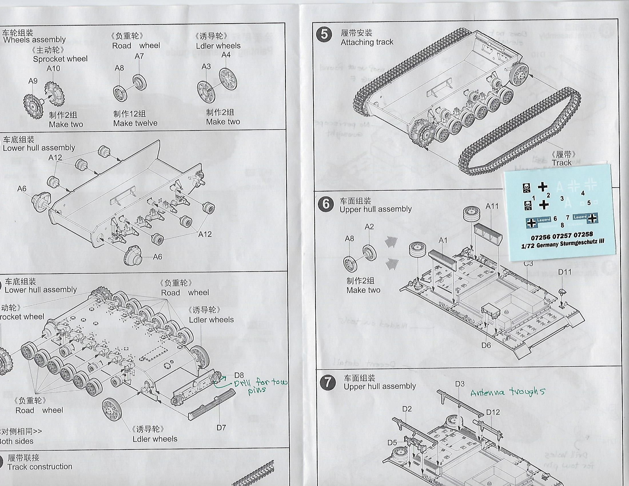 | The Trumpeter Sturmgeschütz Ausf. E kit 7258 instructions above are clear. Comparing these instructions is an informative way to look at the differences between these short gun Sturmgeschütz models. Trumpeter's instructions I find clear and simple. In Step-3 we see the installation of the band tracks typical of most Trumpeter small scale kits. In Step-6 I see installation of the spare roadwheels (parts-A8 & A2) on the rear fenders which are not included in Trumpeter’s StuG Ausf. B and Ausf. C/D model kits. The small water slide decal sheet at upper right is the same as for their 1/72 StuG III Ausf. C/D model kit. |