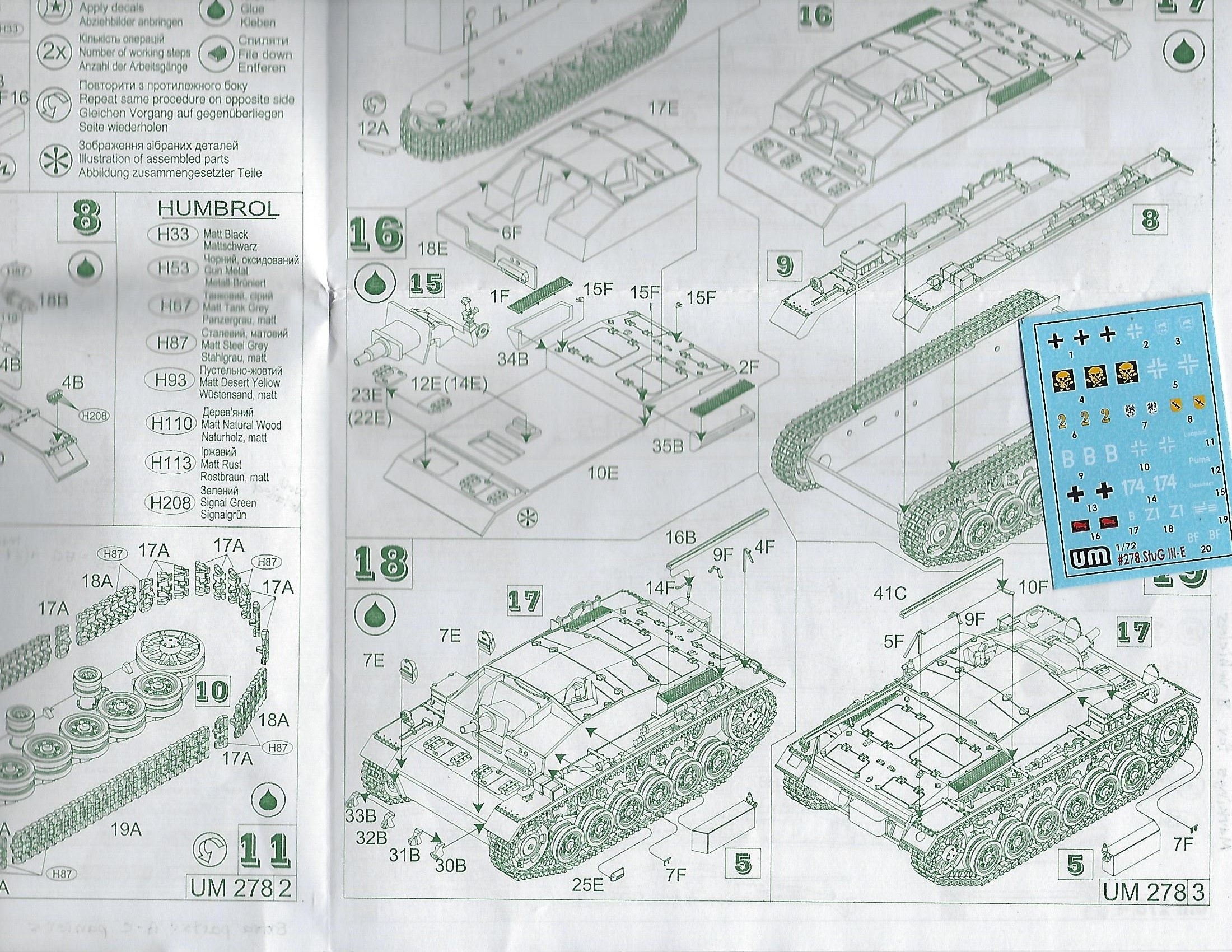 UM Sturmgeschütz III Ausf. E kit no. 278 In step-16 we see UM's nice gunsight protruding through the roof opening. The Trumpeter, Attack and Dragon kits reviewed here do not have this good feature. Kudos to UM for including this. At lower right is the water slide decal sheet for this Uni Models kit. UM offers markings for eight vehicles, all for the eastern front in 1941 and 1942. This is great. |