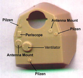 There are some additional considerations as well. First of all, the bogie wheels. There were two styles of wheel hubcaps seen on the versions we are considering: the early version, and the late "forged" version, which appeared with the Ausf. H. It appears that the kit includes the forged version, but at this small scale, it really is difficult to tell, and they could pass for either type. The return rollers were changed to steel with the Late Ausf. H version, but the return rollers on the kit are so poor, that they could pass for anything, if painted right. Also, there should be a vision port on the turret front, to the left of the gun mantle, for the gunner. This port was present on all versions, but it is not included in the kit. Another consideration is the radio antenna. The location of the antenna mount varied with the vehicle version, but no mount is included with the kit, so I guess that its location is a moot point.
