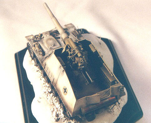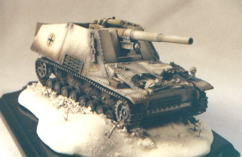 "The Nashorn and Hummel were constructed using the ESCI Pzkpfw IV kit chassis and running gear. Resin castings were made of a Pzkpfw III drive sprocket, and substituted for the kit ones. The chassis were lengthened, and sheet styrene used for all superstructure assemblies. The guns and all equipment are scratchbuilt, using styrene rod, tubing, sheet, and strip."