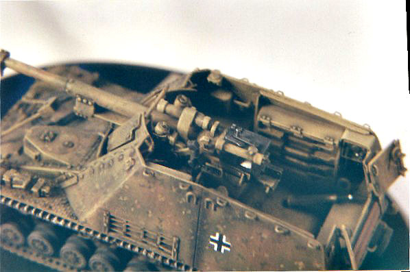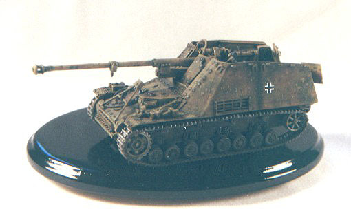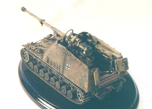 "The Nashorn and Hummel were constructed using the ESCI PzkpfwIV kit chassis and running gear. Resin castings were made of a PzkpfwIII drive sprocket, and substituted for the kit ones. The chassis were lengthened, and sheet styrene used for all superstructure assemblies. The guns and all equipment are scratchbuilt, using styrene rod, tubing, sheet, and strip."