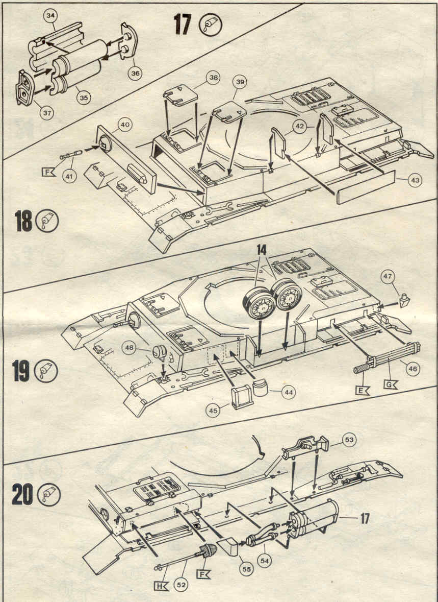 Here in Revell's 31-step Pz IV Ausf. H kit 3119 instructions we see the assembly of the mudguard mounted air cleaner in step-17 (parts 34 though 37) and then its mounting on the model in step-20. This air cleaner appears to be an identifying feature for the Pz IV Ausf. H. There is a small cutout on the side of the rear mudguard just behind the shovel (part 52) that should have a simulated spring installed; the DML kit has this spring simulated on the model.