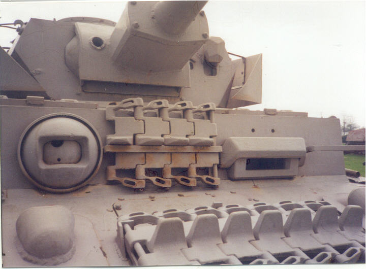 At the rear we see the copper-rod radio antenna rising up from the engine deck signifying this is an Ausf. H or Ausf. J; the Pz IV G had the antenna mounted on the front mudguard next to the radio operator's position. On the hull side we see the hull side skirts (Schürzen) made up of six 5-mm thick steel plates that slightly overlap and hang from a long rail suspended away from the mudguards and hull with brackets. The Pz IV H and Pz IV J side skirts hang on triangular hooks so the skirts can slip off if caught on something. (It is common the see Pz IVs with the side skirts removed and just having the turret skirts remaining).