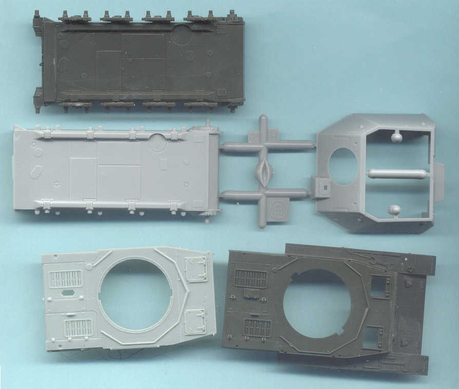 In the center are the turret parts molded in four main parts to DML's three turret main parts. The side doors for the turret (parts 73 & 74 or parts 98 & 99) mount into the rectangular depressions in the turrets sides (parts 63 & 64). If we wish to mount a side door open, we'll need to open up the turret side and add some interior detail to the small doors.