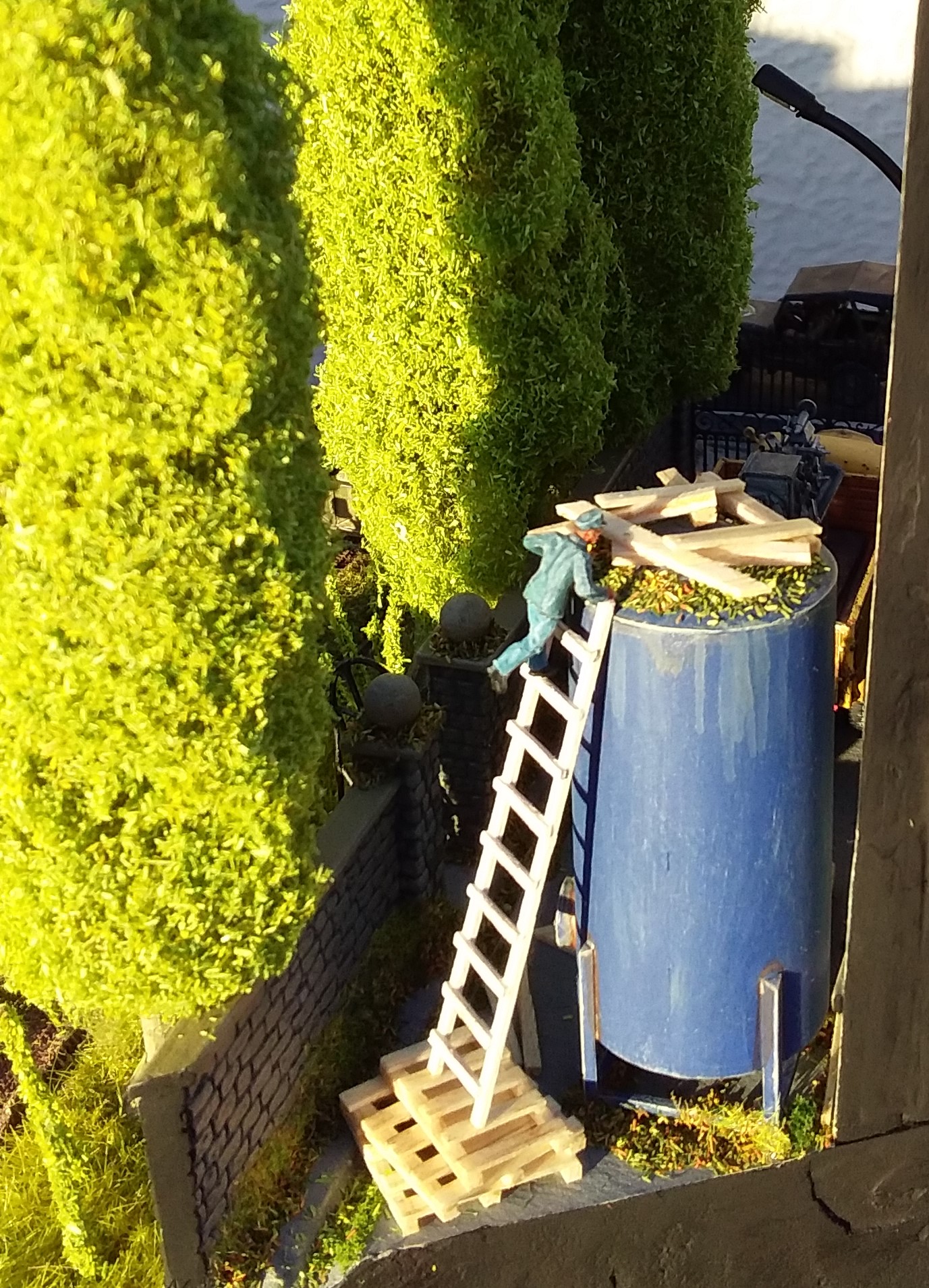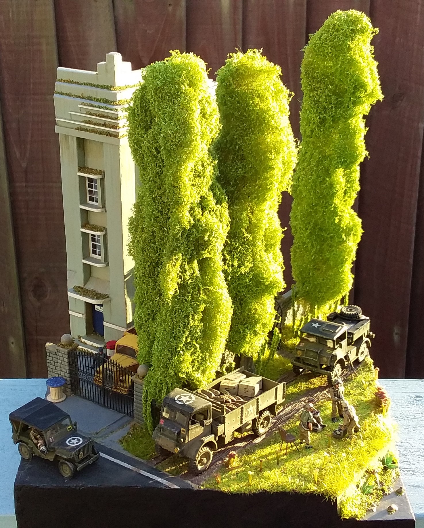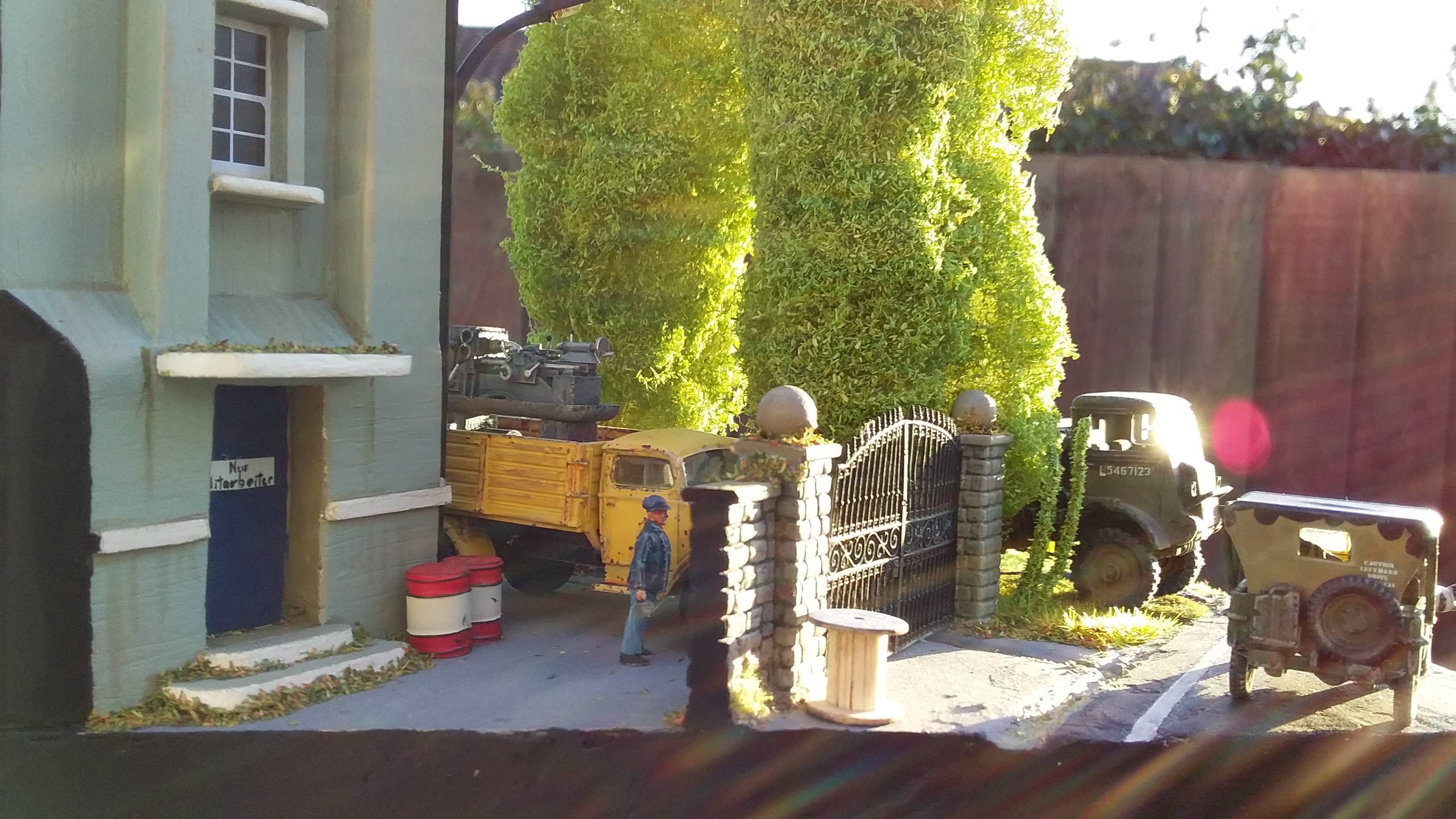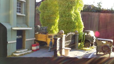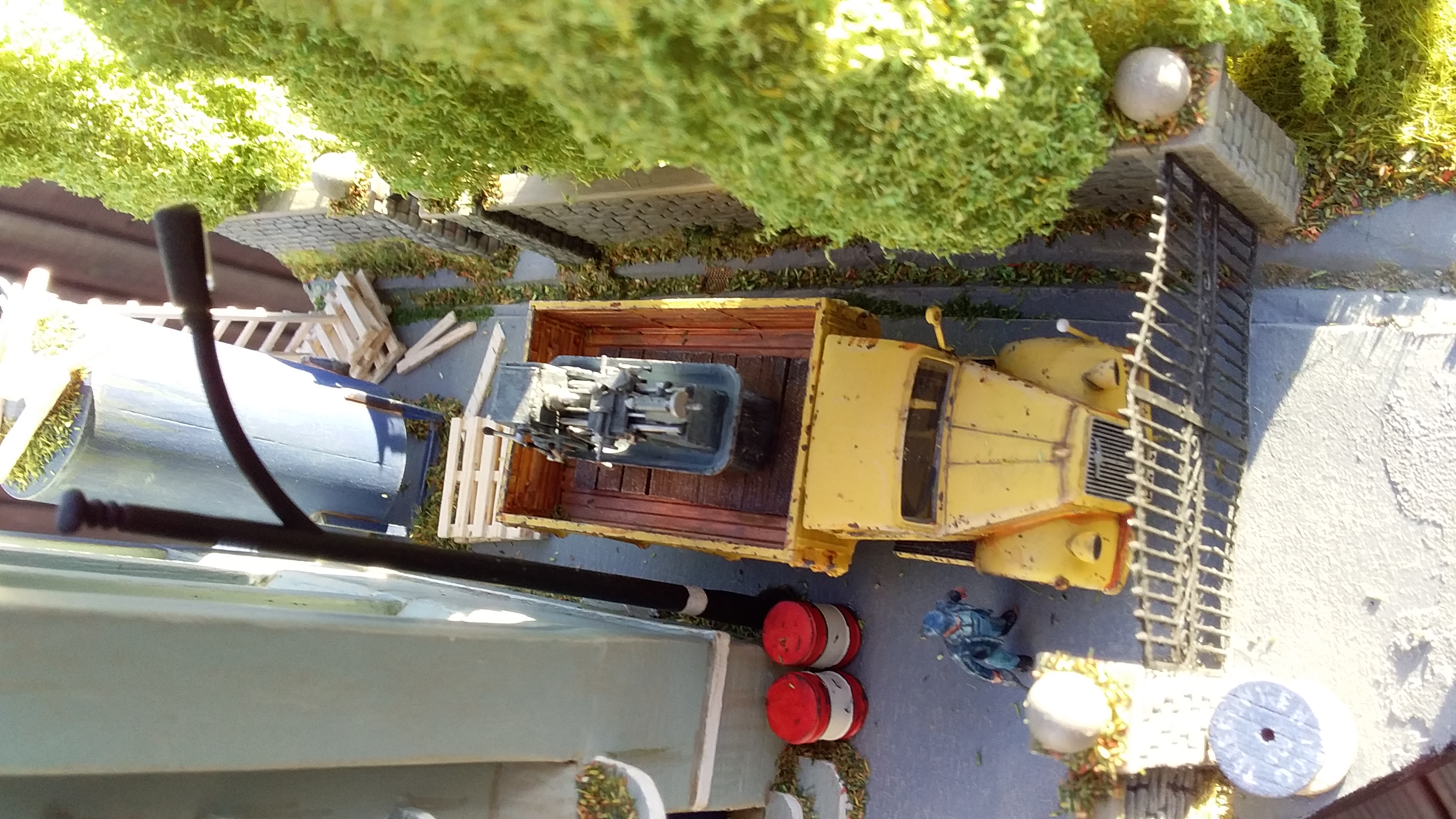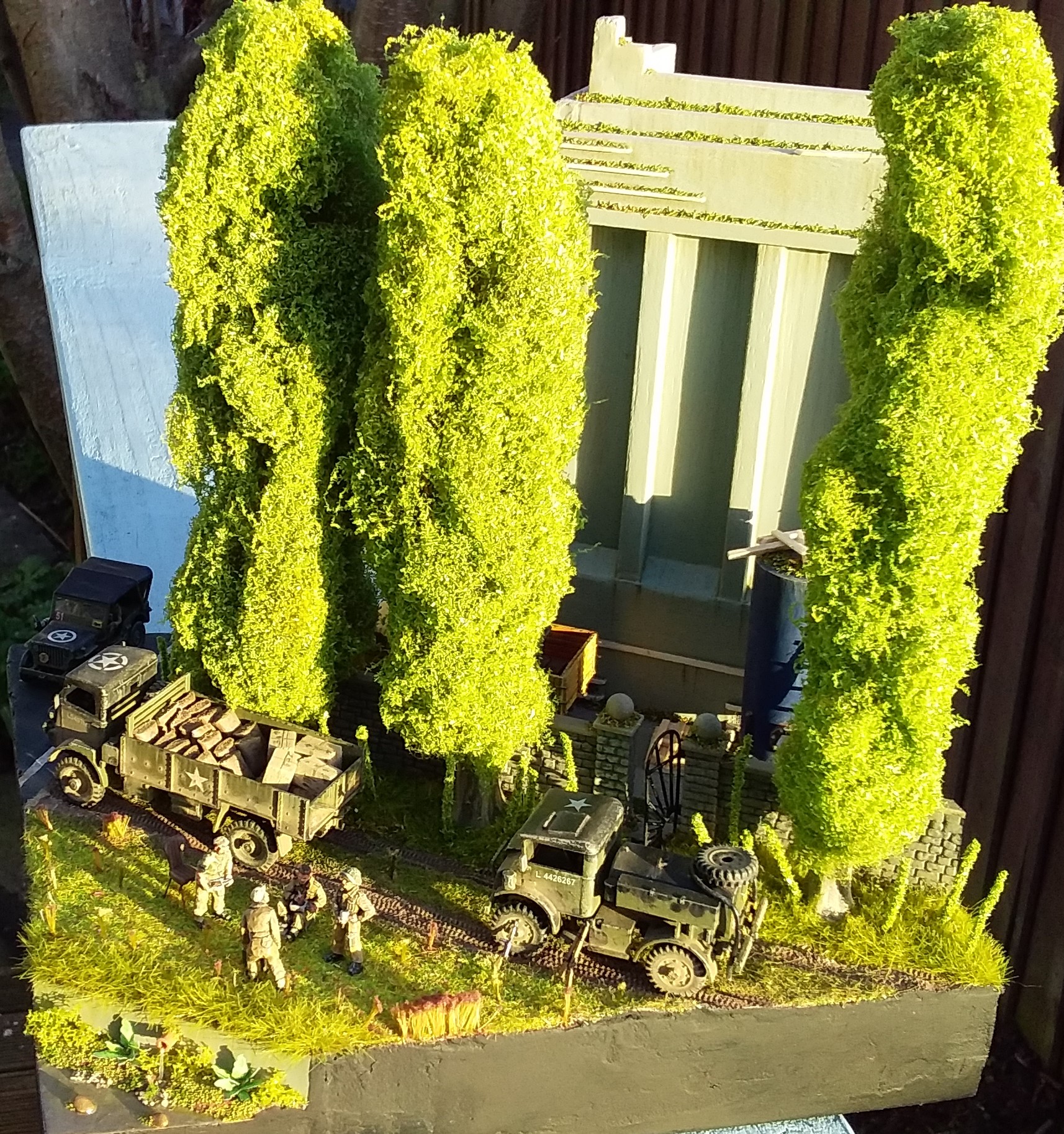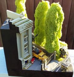 For the Poplar trees I used copper wire armatures covered in polyfibre and flock with trunks made of clay. The building is based on the Art deco style of the 30's and is made of balsa wood. I used balsa to make the cable reel, pallets, planks and ladder. The flowering grass tufts are baling twine and flock and the rest of the scenic material is by Woodland Scenics and Noch. To make