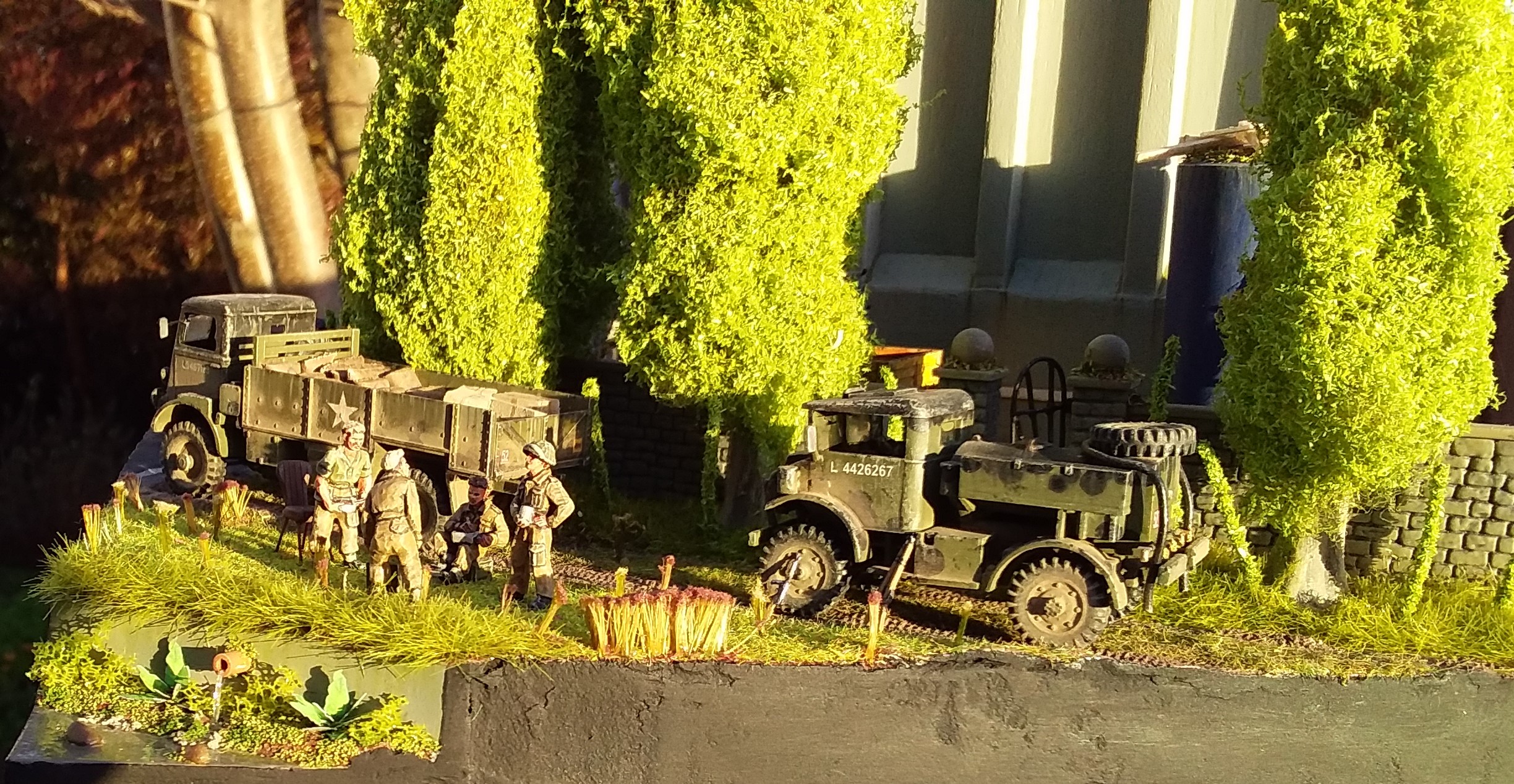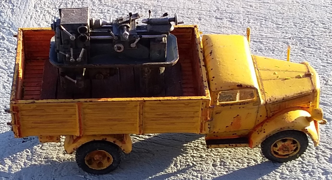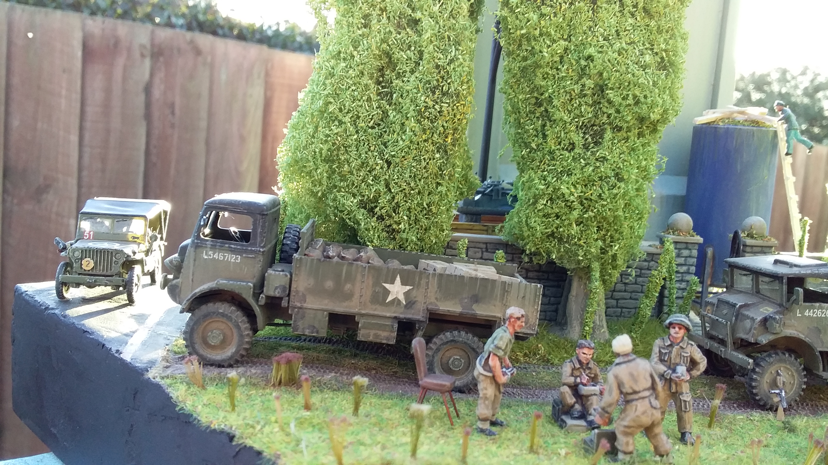 down it. I made the lathe from scrap plastic and balsa. In the middle of it is a spare wheel holder from an IBG CMP truck. The passenger in the jeep has a balsa wood leg splint with masking tape bandages. He was meant to be a tank rider but he mostly fitted in the jeep.