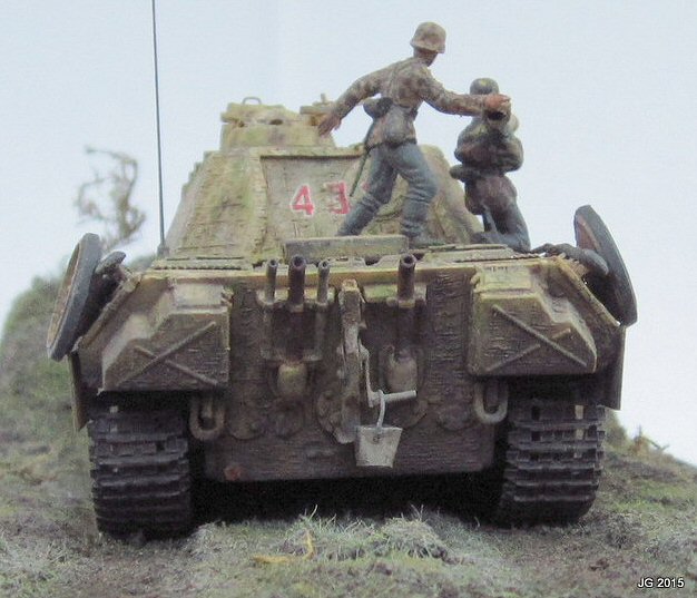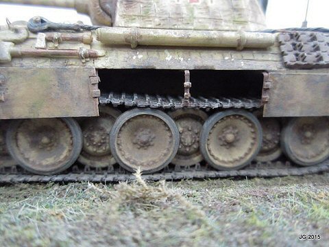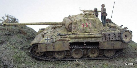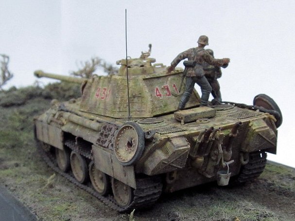 This is Esci my Panther A, which I built years ago then set aside to wait for better tracks to magically appear. They finally did, in the form of OKB Grigorov's Panther mid production resin tracks. These are magically superb castings, the quality is first rate. New tracks in hand, I added hot knife Zimmerit, schurtzen and a full complement of hangers, and fabricated the MG mount and other small parts. The yellow is acrylic sprayed, the green/brown mottle is artist's chalks, sealed with Krylon matte fixative. The figures are vinyl and added for scale effect. Let's just say the model represents a scene in Normandy as I wrote the actual unit info on the hull bottom, and the model is now affixed to the base. Most gratifying for me was finally finishing this model after two decades of sitting on the shelf and having it meet my expectations of both then and now. |