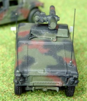 This M966 is the die cast kit made by ARMOUR. I bought it in 1998 and it seems that the production line is already closed. I think the kit is correct in 1:72 scale. The camouflage is resprayed so that it is more close to the real one. The left and right reflectors were remade with copper wires. It is quite expensive, about 20USD in Hong Kong.