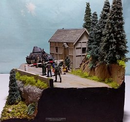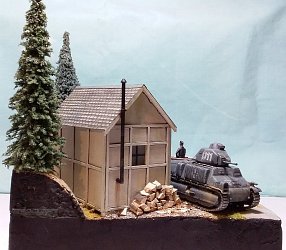 The infantryman is Zvezda and the panzer crew are Orion. The two standing crewmen hide the worst parts of the Heller S35 tank; one hides the track join and the other covers the toothless drive sprocket. That's a Dragon MP 40 on the engine deck and I made a new gun barrel for the S35 from stretched sprue. Scenic materials used are by Noch and Woodland Scenics with an Italeri stone wall. The guard hut is made of balsawood with a cardboard shingle roof left over from a Metcalf card building kit. For the stovepipe I used plastic rod and the firewood is from a Wattle twig. |