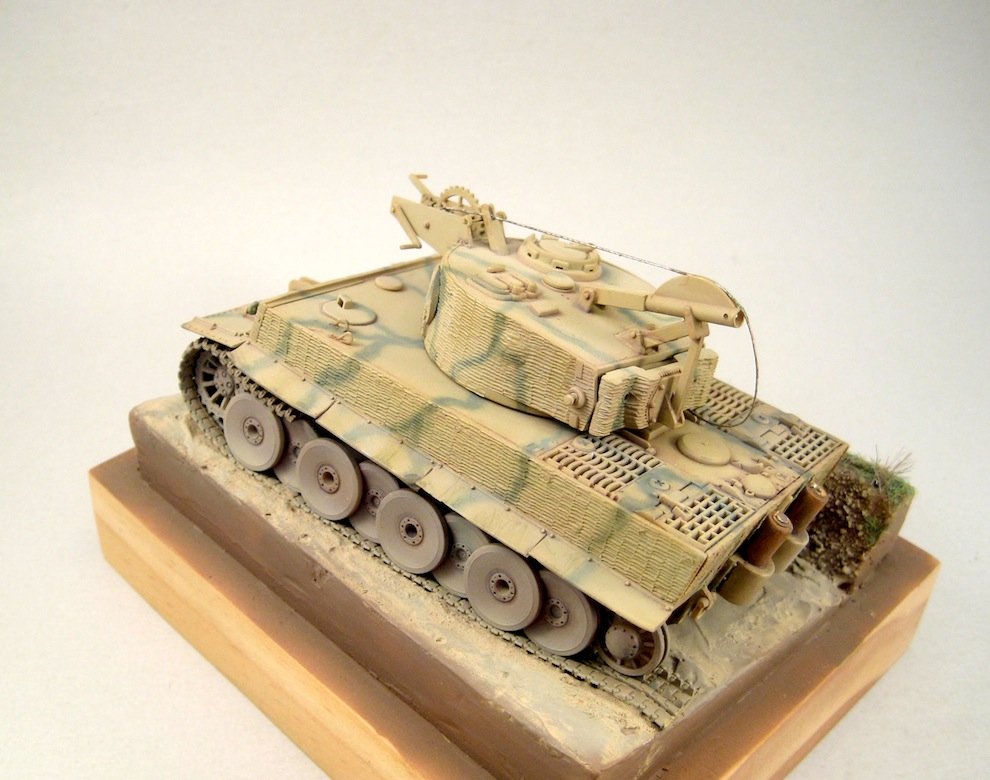 This was built for a club contest. One of our younger, long time members had diabetes and it finally caused his death... suddenly. The club auctioned some of his incomplete models for a contest, the proceeds of which went to the widow. We were to complete the models for the July 2011 meeting. My little Bergetiger took second place. When I received the model, it was all built except for the side skirts, road wheels and track. I don't like to build tracks, I'm not very good at keeping them straight and these old style Dragon tracks were reported not to like glue of any kind. There is some confusion as to the purpose of this modified fighting vehicle. Googling, I found a photo of the "real thing" abandon by the road and on the front was a tow bar and fitting not found in the kit. So I assumed this was indeed a recovery vehicle and that the light weight crane was to help lift and move track and road wheels. Anyway, the photo showed one run of track gone (yeah!) and I decided the Germans had stripped most of the other track and all removable equipment on the deck. I built and added the fitting to the glasic plate then built a tow bar and its fitting. The crane was modified to match closeup photos found on Google. I drilled out the solid webbing on the drive sprocket, very easy to do with a Dremel and small bit. Since this was just for the club I didn't make any more mods or try for super detailing. The paint is a typical Italian theatre scheme and the weathering is as if the real vehicle had been sitting there long enough to collect a heavy coat of road dust. The base was for practice as an experiment in making scenic bases. The tank is attached with a hefty screw through the bottom, accessed by removing the turret. Except for the old style tracks, this was a very nice kit, but I had to shim out the return/idler wheel because it didn't line up with the track. The zimmerit is very nicely done. |