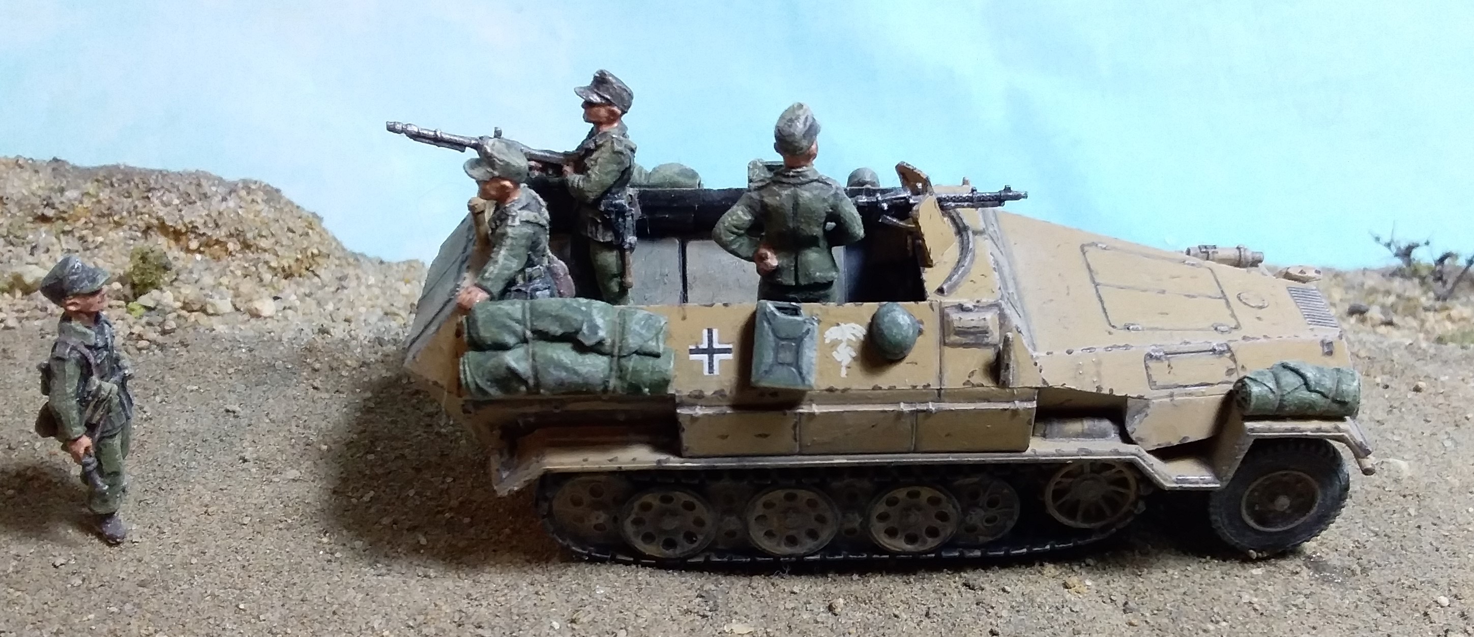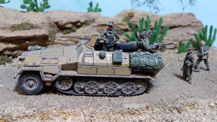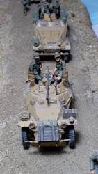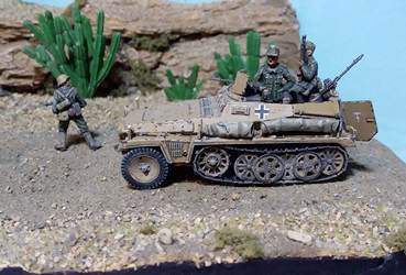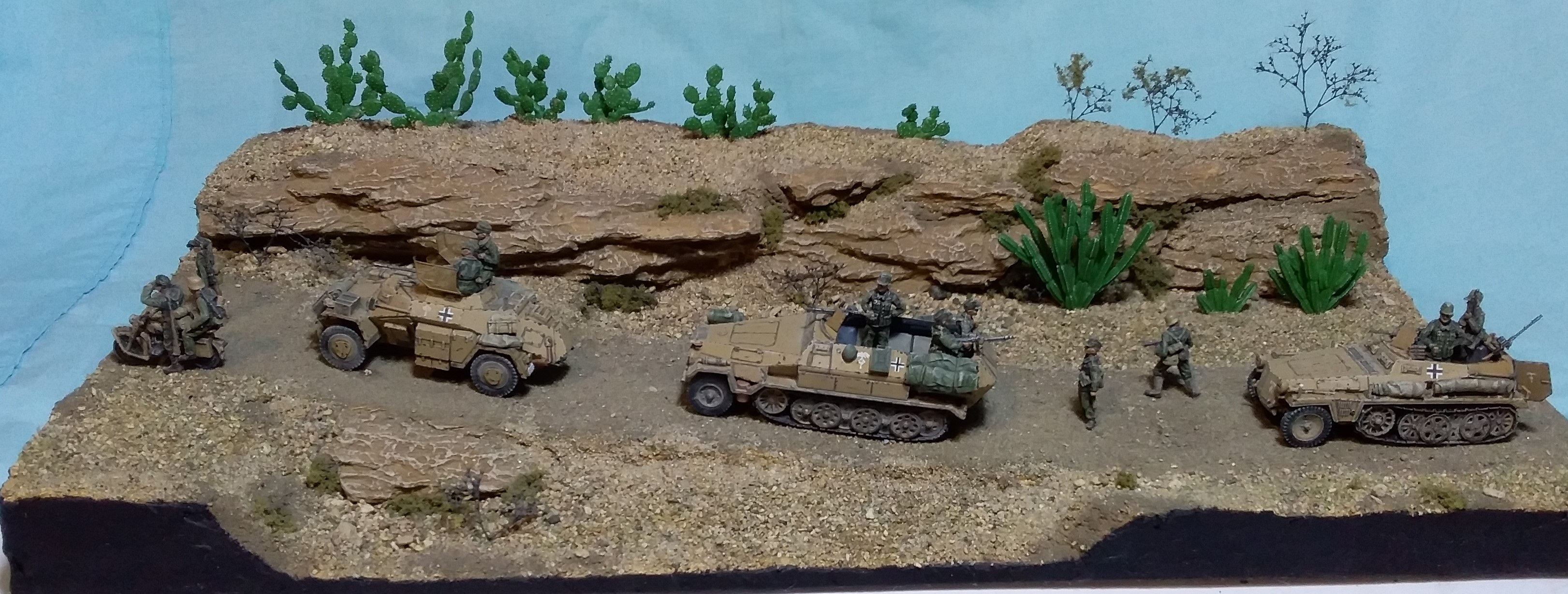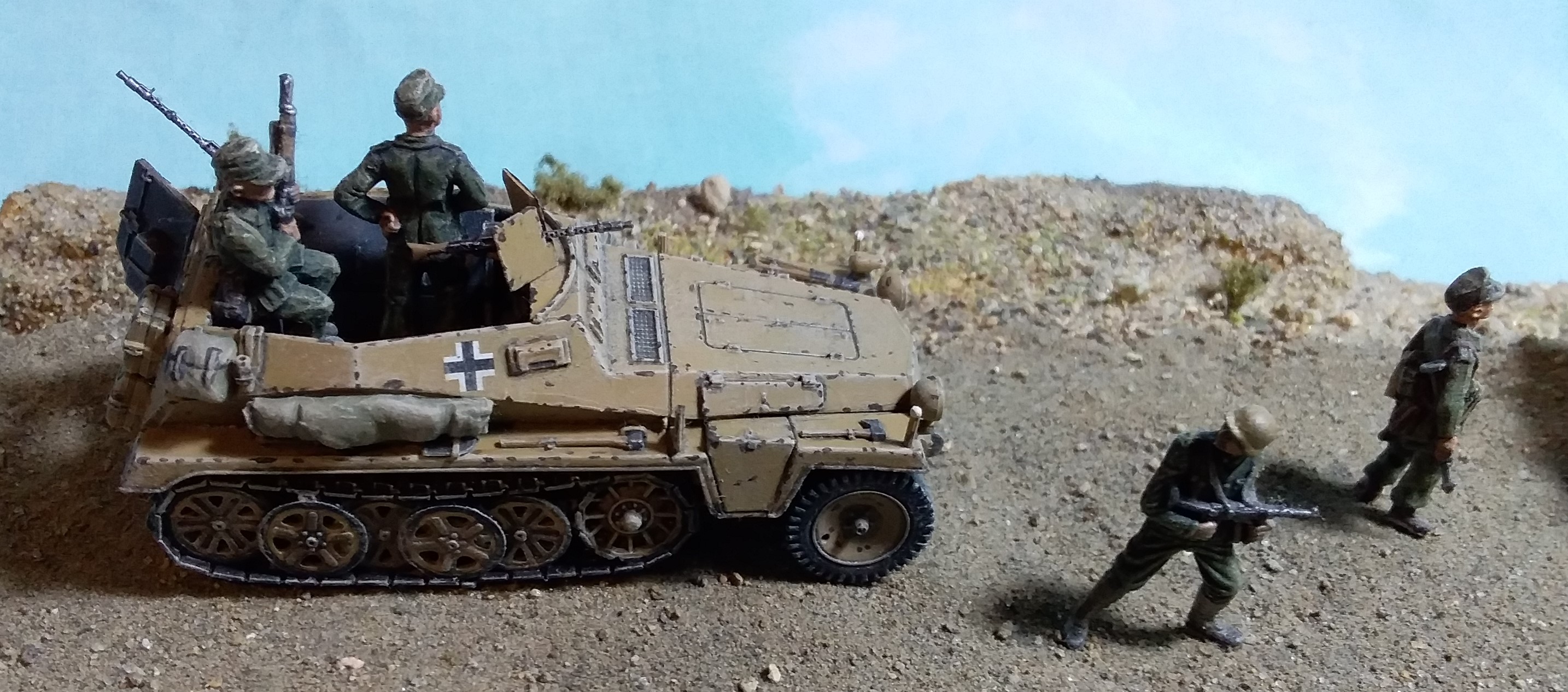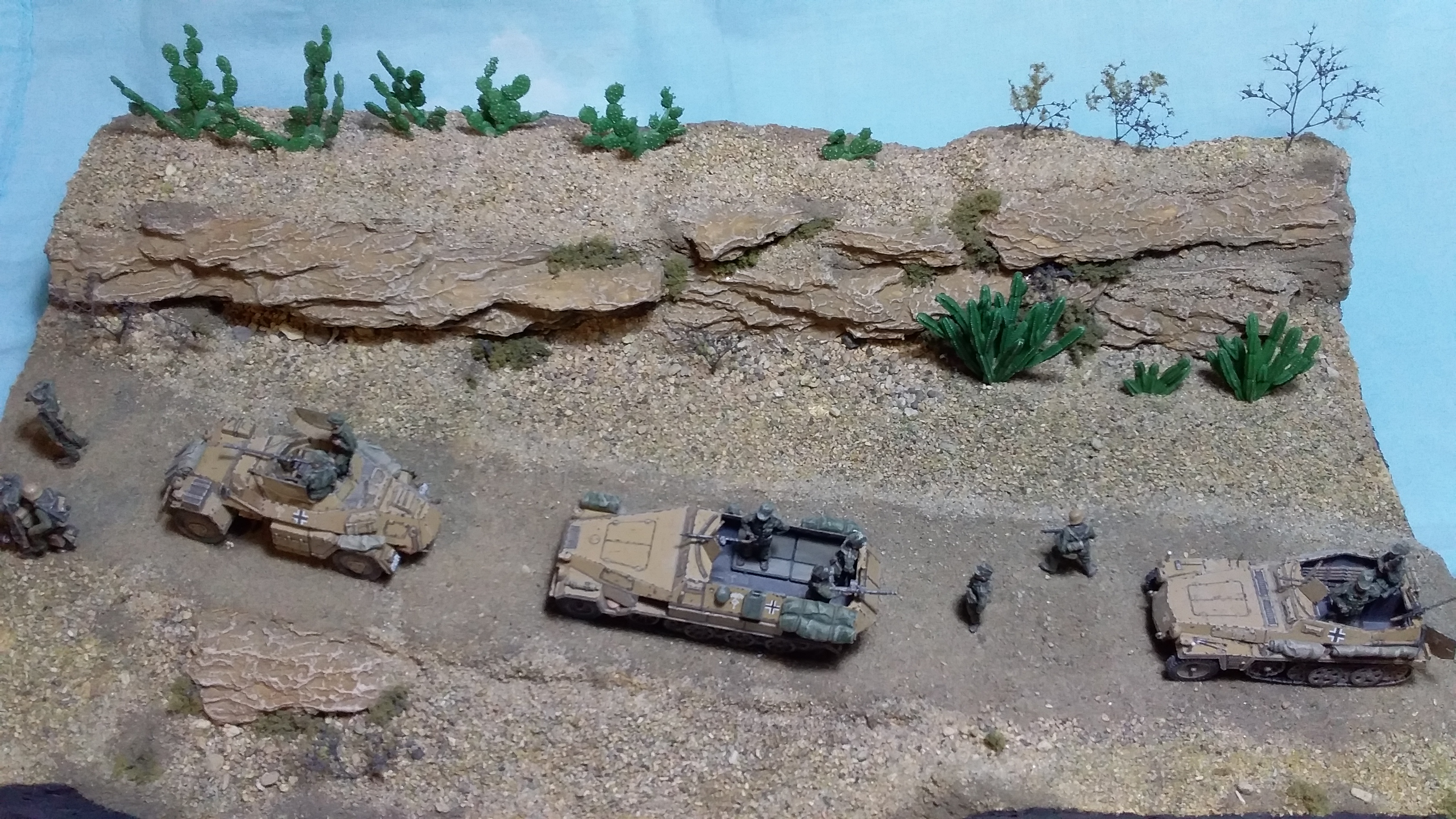 The vehicles are: SdKfz 222 by Dragon I converted the FTF 251 from Ausf A to B by adding a spare Revell MG shield and carving off the tools and vision port visors and hiding the scars under stowage. I used Woodland Scenics rock molds to make the rocky