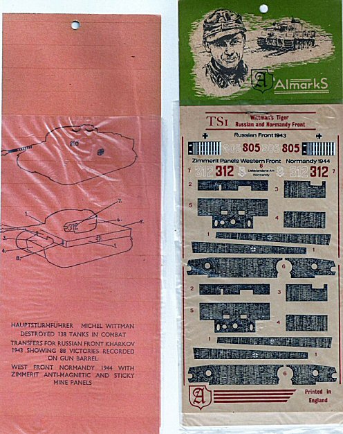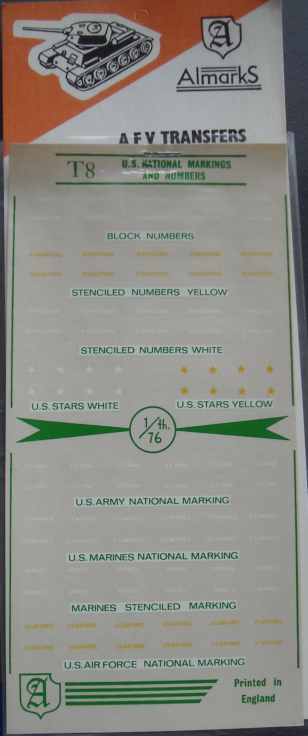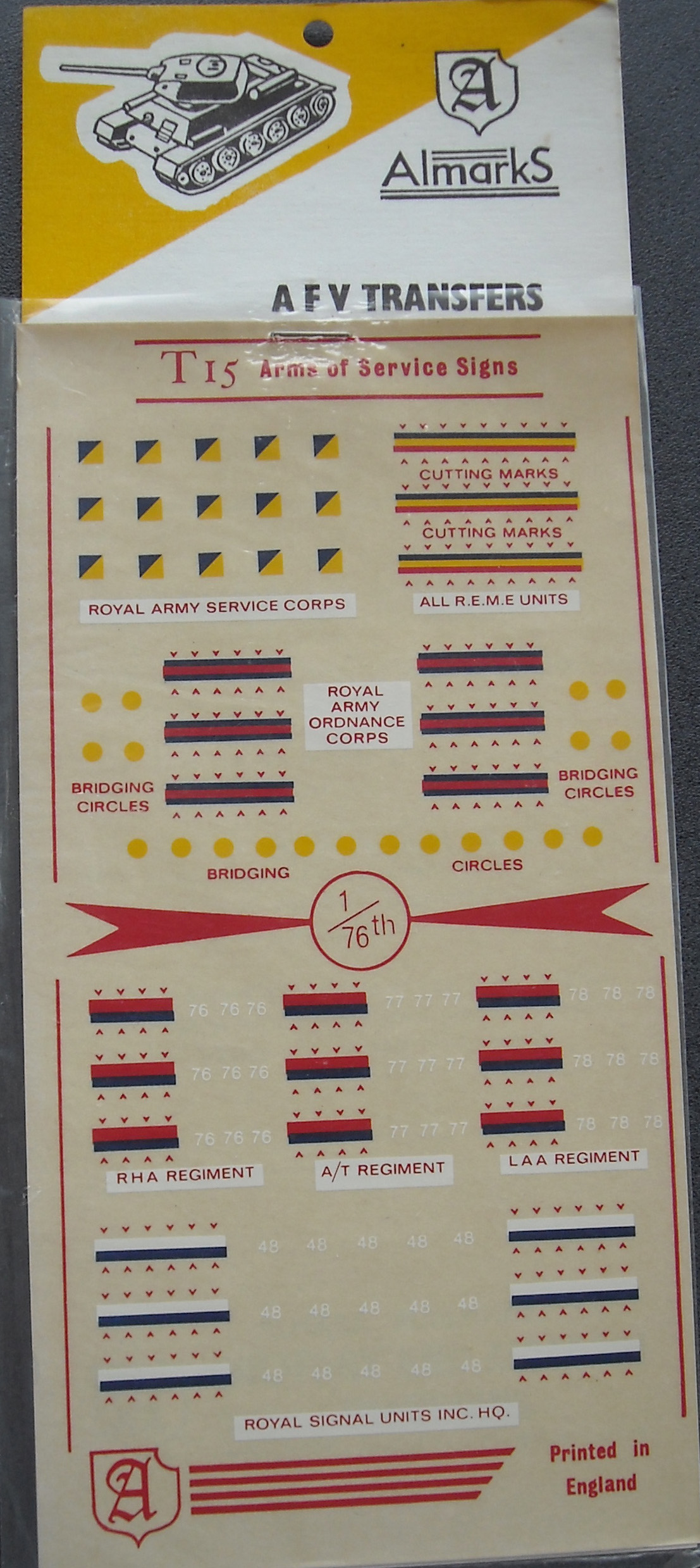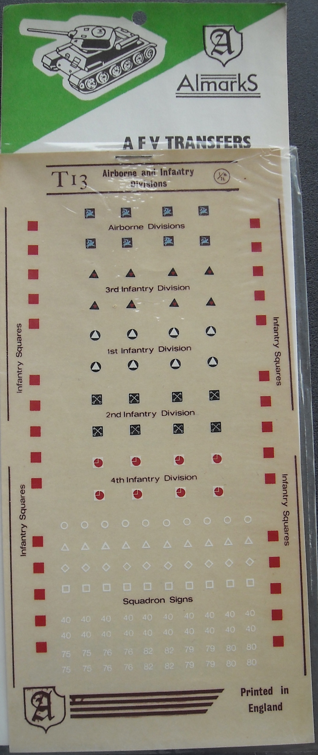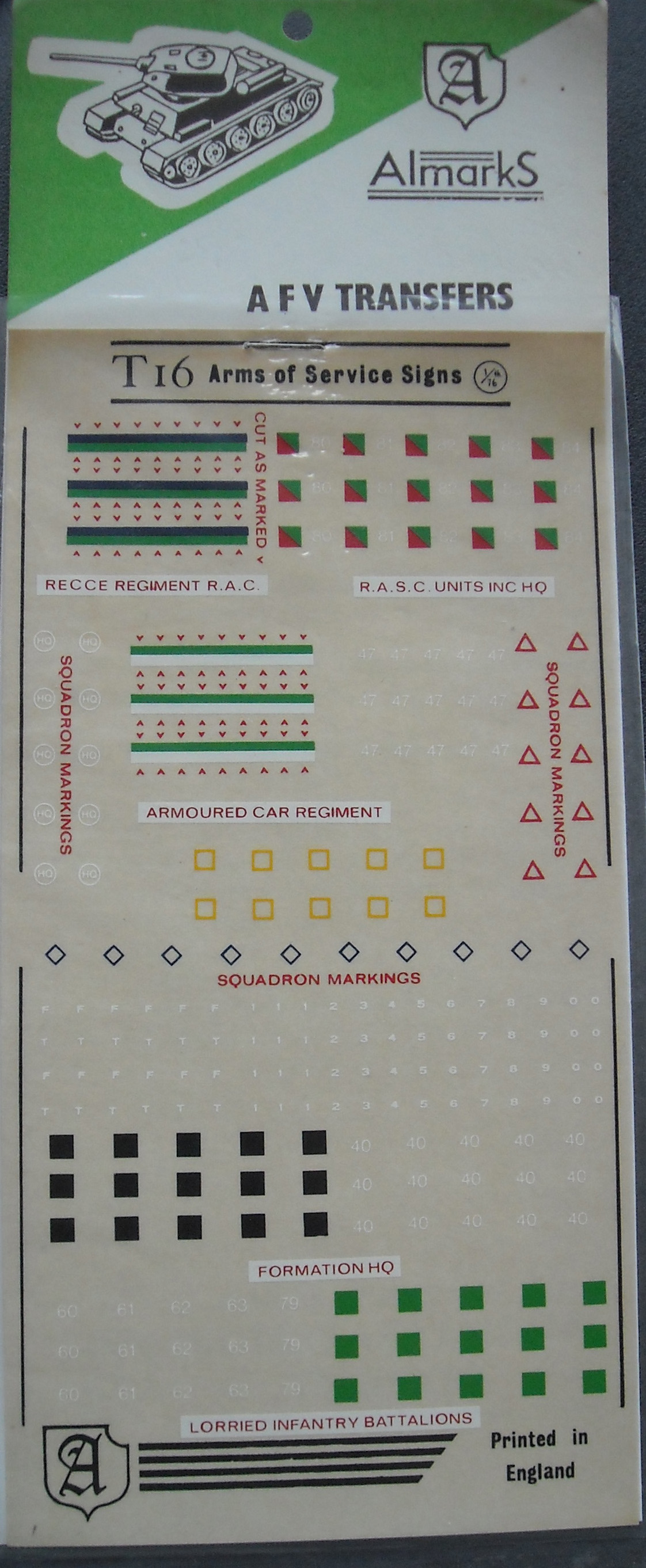 Decals made in Great Britain. Almark decals is now out of business. Also released under the ED Models name. They did a series of well known and very nice aircraft decals, but we only stumbled across the AFV series by chance. If the properties of these decals are the same as those of the aircraft decals, then they are very good, and have the nice property that the carrier film can be removed after they have dried on the vehicle by very gently rubbing them with a cloth that has been moistened with a small amount of 'white spirit'. These decals are listed as 1/76, but they will more than likely do just as well for any corresponding vehicle in 1/72. What is sure is that this list is not complete.