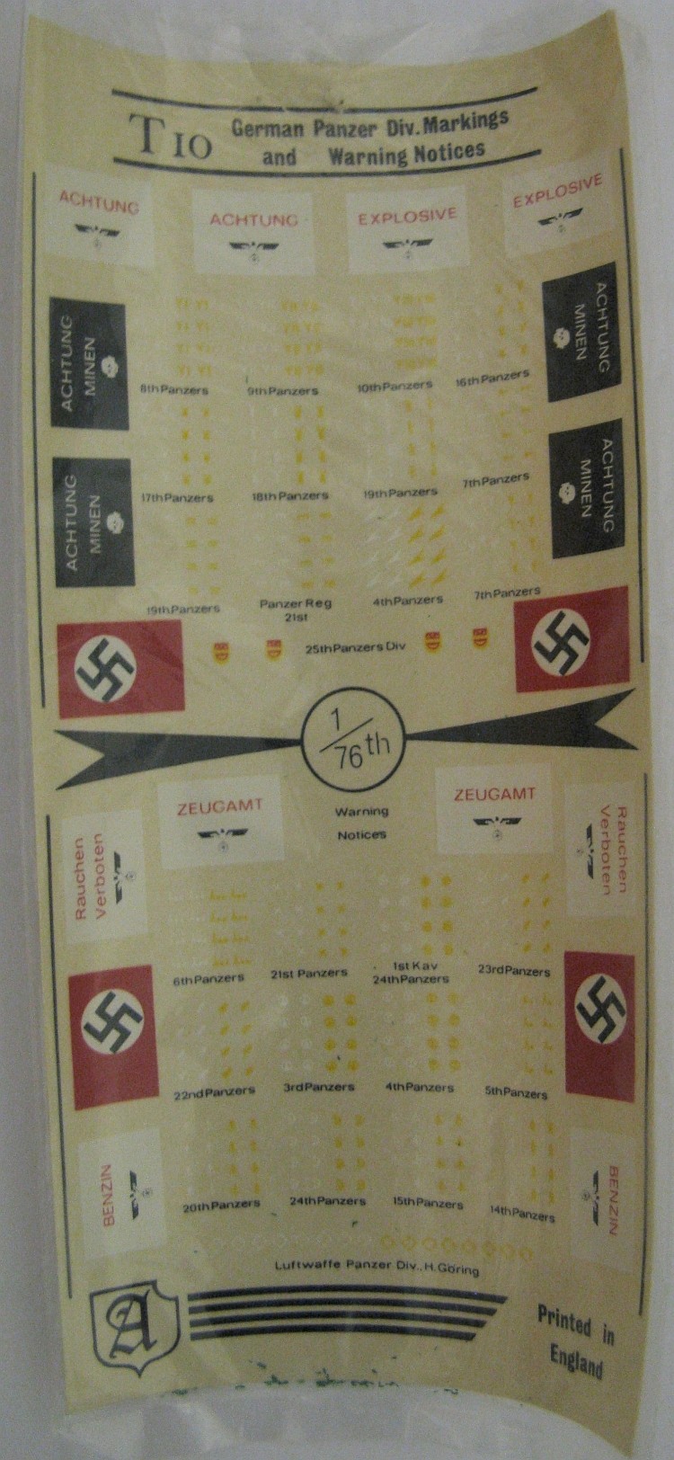 | T10 | German Panzer Div Marks & Warning Signs | Contains the following: - Various signs (2 of each): Achtung, Achtung Minen, Explosive, Rauchen Verboten, Zeugamt, Benzin - German national flags (4 copies) - A series of divisional markings in both yellow (4 each) and white (4 each) for 3, 4, 5, 6, 7, 8, 9, 14, 15, 16, 17, 18, 19, 20, 21, 22, 23 and 24 Pz.Div. - 25 Pz.Div. (4 shields) and Hermann Göring Panzer Division (8 each of yellow and white) - Al Magnus |