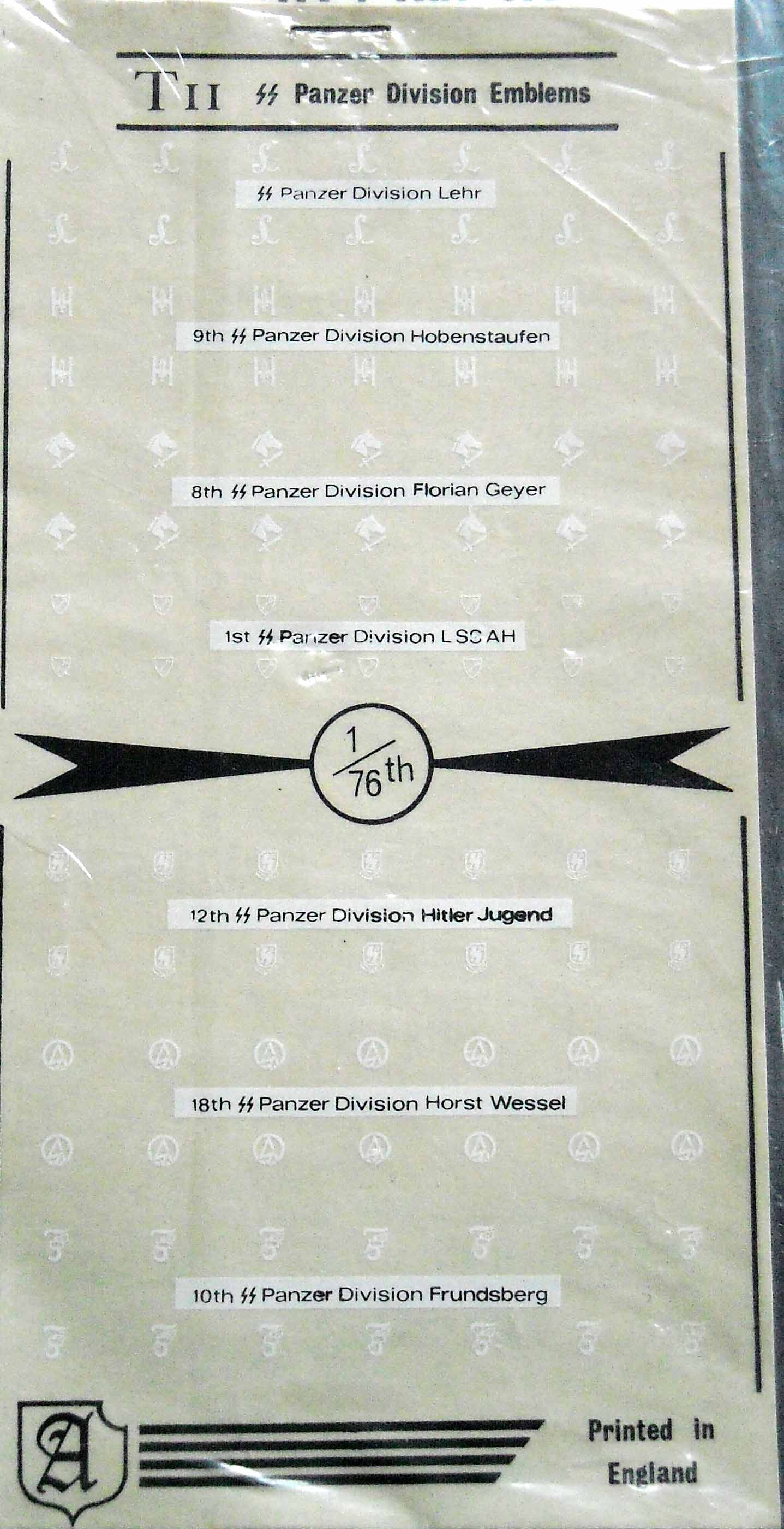 for - SS Panzer Division Lehr [sic]. Never mind that Pz Lehr was a Heer division. - 1 (LSSAH), 8 (Florian Geyer), 9 (Hohenstaufen), 10 (Frundsberg), 12 (HJ), 18 (Horst Wessel) SS Panzer Division [sic]. Never mind that 'Florian Geyer' and 'Horst Wessel' were not Pz Div. as such. You get a comfortable number (14 to be exact) well-rendered insignia per division. Except for LSSAH, they are a bit on the large side, so might be oversized for the smaller AFV.- R. Haelterman |