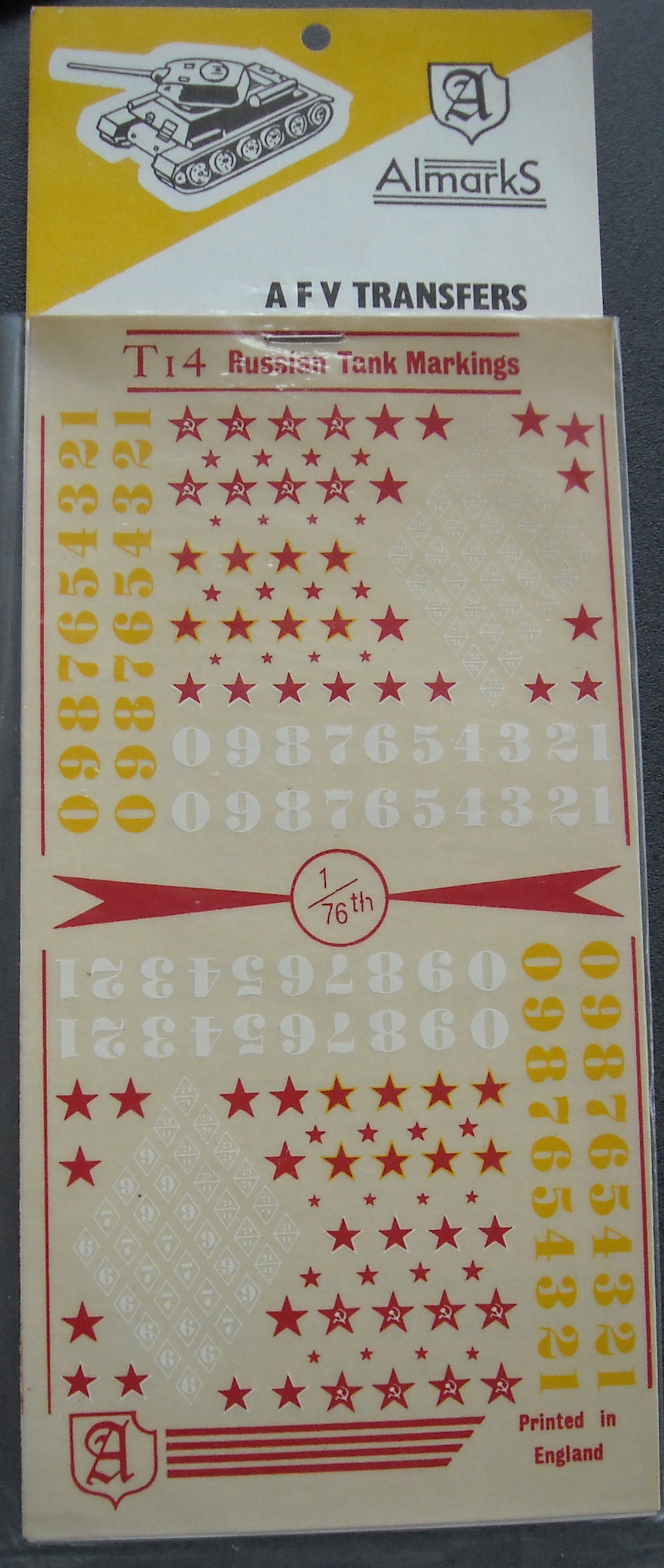 | T14 | Russian Tank Markings | Contains the following: - A large assortment of red stars in various styles and sizes, incl. white-bordered, yellow-bordered and with hammer and sickle superimposed. The white borders are slightly out of register. - Diamonds with varios numerical combinations - Large yellow and white "Soviet style" numerals - R. Haelterman |