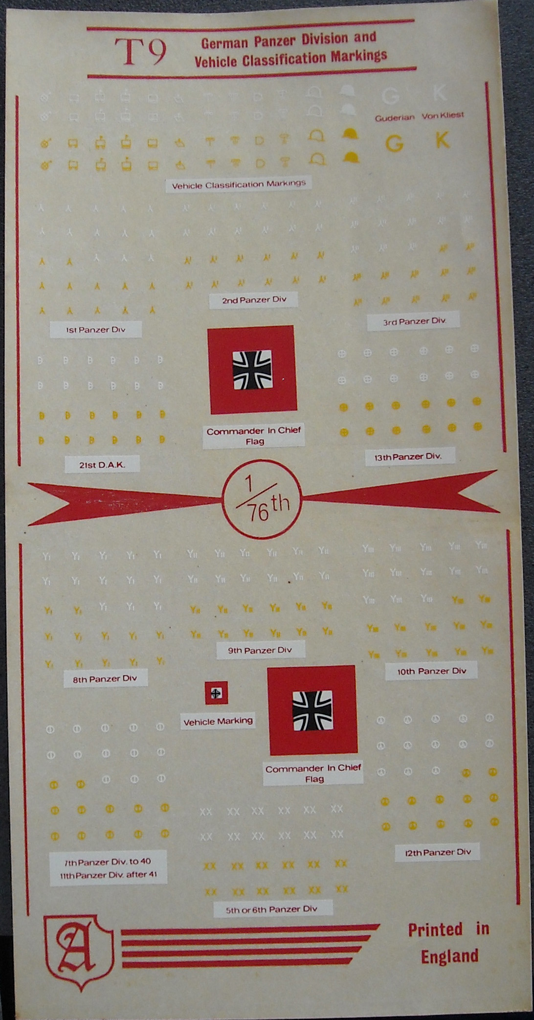 | T9 | German Panzer Divisions and Vehicle Classification Markings | Contains the following: - Vehicle classifcation markings, each in yellow and white (e.g. 'towed artillery', 'motorcycle', etc.). In these Almarks also includes unit markings for Grossdeutschland in yellow and white ('solid' and 'outline' style) and the "G" and "K" markings for 'Guderian' and 'Von Kleist' respectively in white and yellow. - A series of divisional markings in both yellow and white for 1, 2, 3, 5, 6, 7, 8, 9, 10, 12, 13 and 21 Pz.Div. - 3 'commander in chief' markings in 2 sizes. - R. Haelterman |