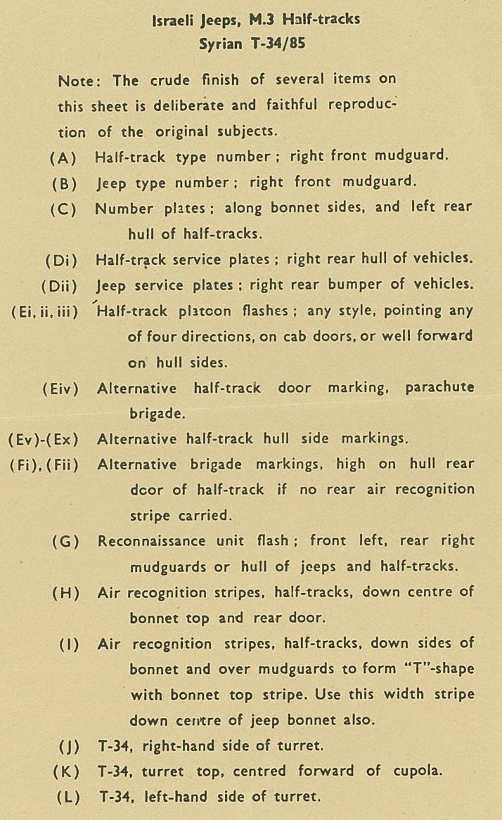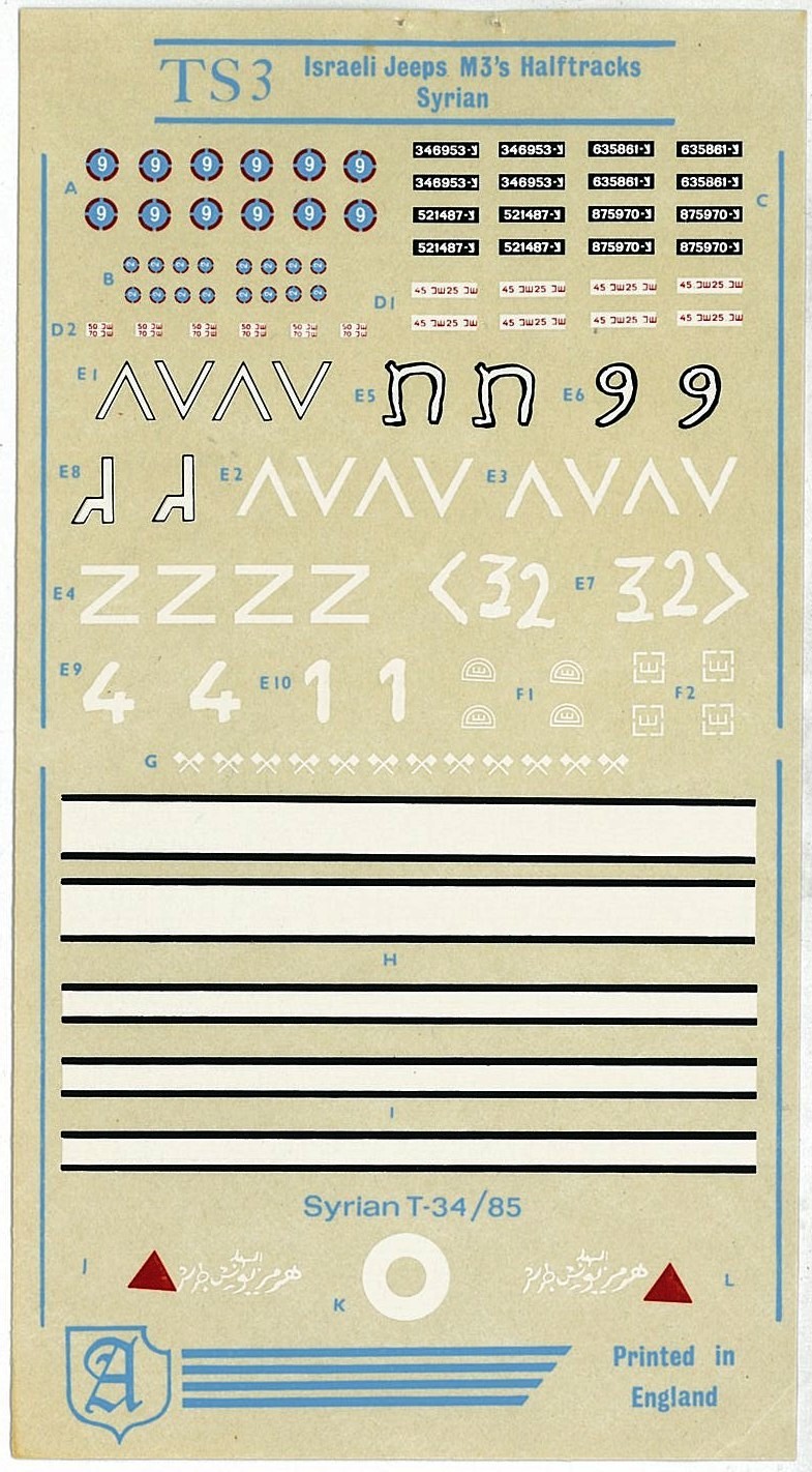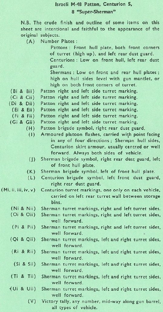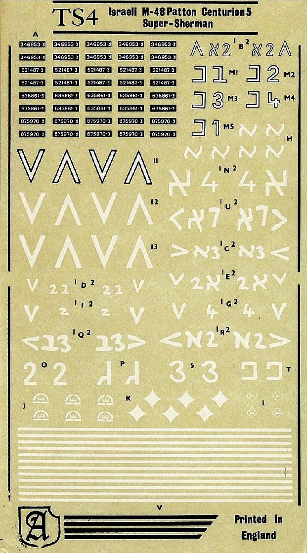 | TS4 | Israeli M-48 Patton Centurion 5 Super-Sherman | This decal sheet was released in late 1960s, soon after the 6 Day War. The vehicle plate numbers are for 4 different numbers only (i.e. 4 sets of 10 plates, each set of 10 with the same number). The instruction sheet covers the vehicles concerned, all tanks, without any picture references. As far as I know at the time of the decal set's release only the Centurion Mk. VIII from Airfix was available. There were no Super Sherman M50, I-Sherman M51 nor M48 in kit form at the time. - M. Pregazzi |