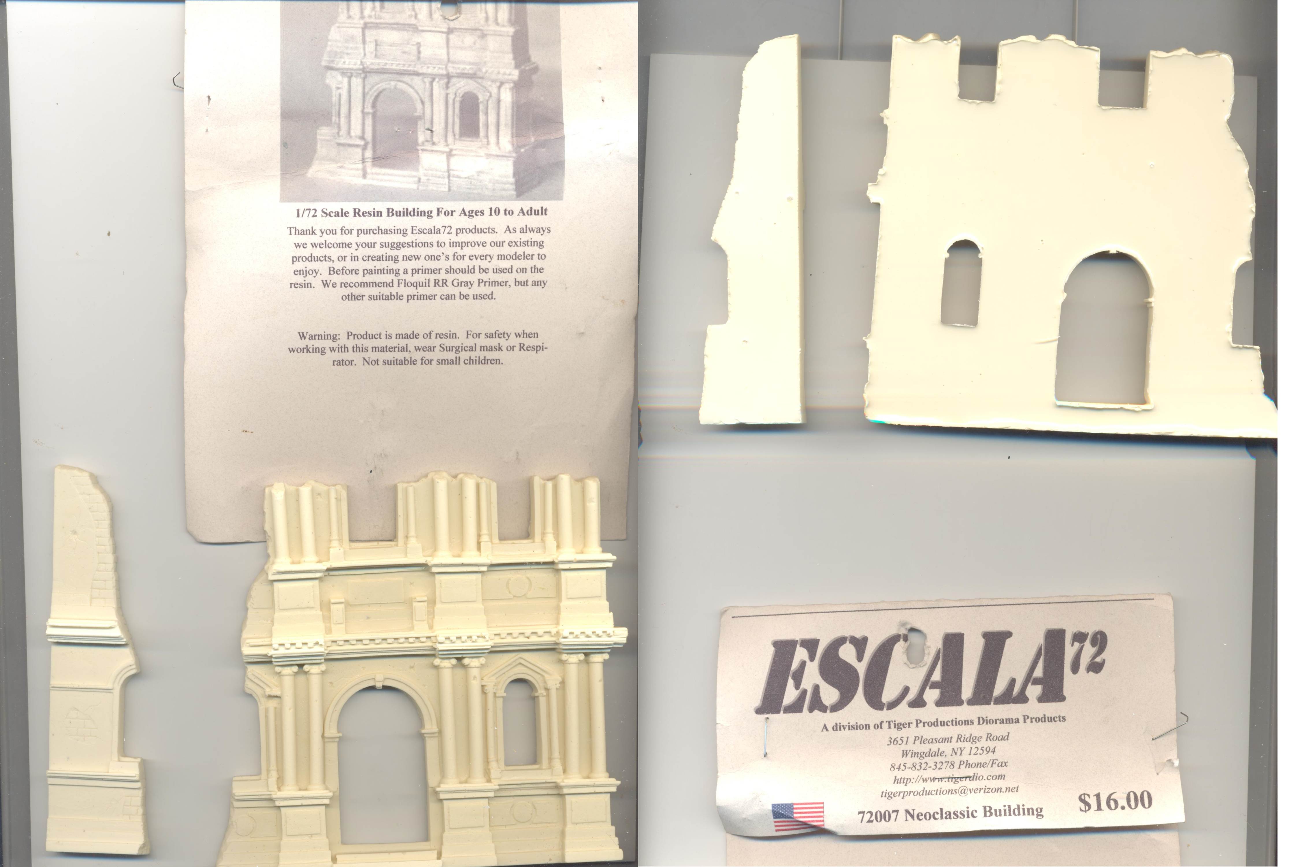under the Tiger Productions - Escala 72 range as Ref 72007.) For a structure of this size, the casting is quite nice. There is no warping, nice detail on the outside, but quite a number of pinholes (air bubbles), part of which might pass as bullet holes, as this is a ruin after all. Clean-up will be minimal as there is no excess resin. Most of the work will go into the creation of some detail on the inside. - R. Haelterman |