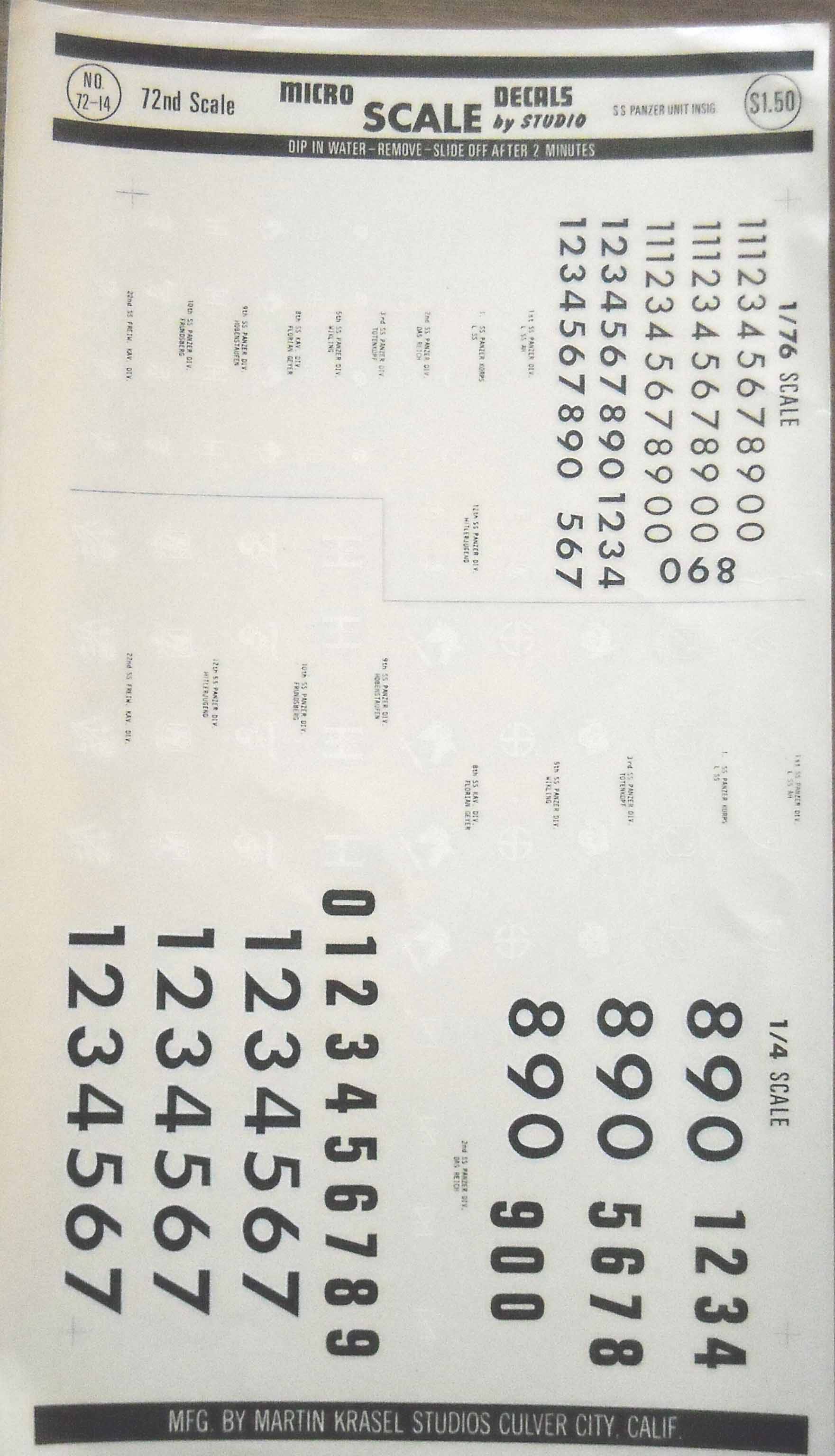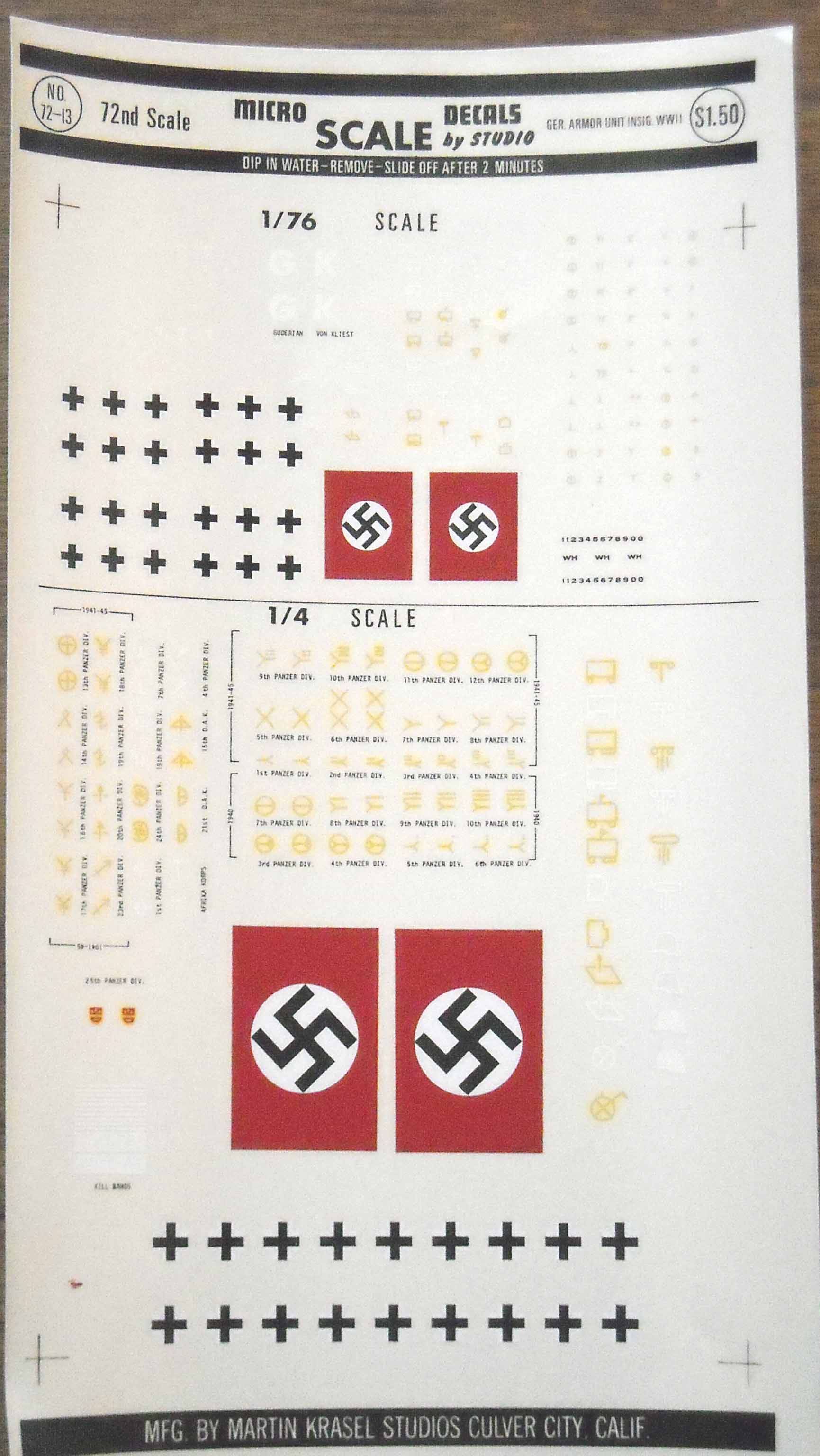 Brothers Ted and Greg Krasel created the Microscale line of decals covering subjects mainly for trains and aircraft. Around the mid 1990s the brothers had a disagreement regarding the business and the company was split into two lines. Greg kept the railroad line retaining the Microscale name, while brother Ted kept the military ones under a new name - Superscale. Greg Krasel passed away a few years later and the Microscale line was sold. Circa 1999, Superscale ceased production, but it seems that Ted Krasel tried to revive the company, though this appears to have been brief before Superscale died completely. Though Superscale now appears to be defunct there are a lot of the old sheets still around. Microscale still exists today, primarily as a railroad and general purpose line of decals, but they do offer a limited line of 1/76 scale armour decals which appear to be the original sheets issued under the Superscale line. Some of the pictures found below are of the old sheets, printed on an off-white background, which makes them quite hard to see. Pictures of the re-releases on a darker background can be found on the Microscale website. |
