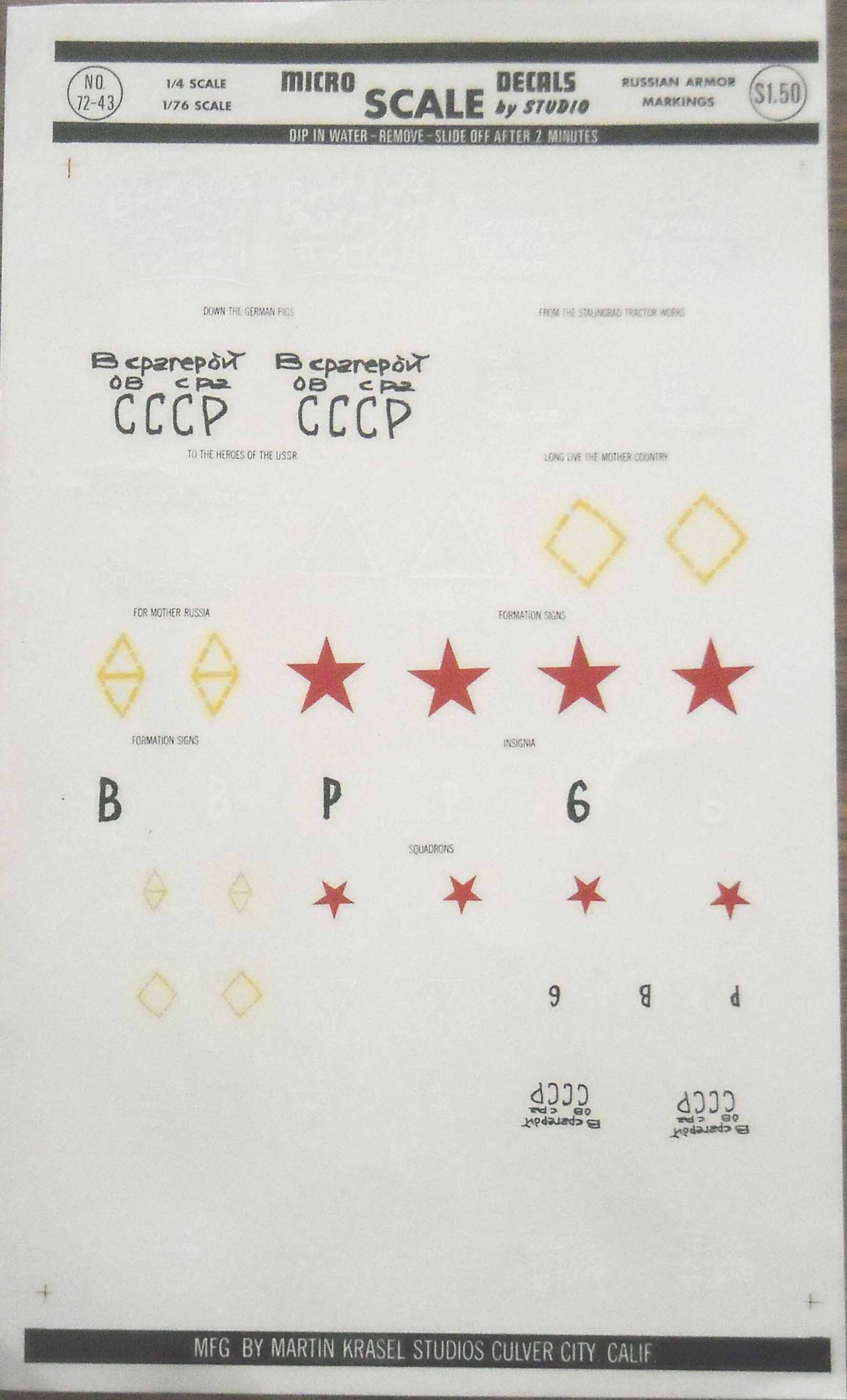 | 72-43 | Russian Armor Markings | OOP The sheet contains the following: - Patriotic slogans: 'Down the German pigs', 'From the Stalingrad tractor works', 'Long live the mother country', 'To the heroes of the USSR', 'For Mother Russia'. - Hand-painted formation signs - 4 red stars - R. Haelterman |