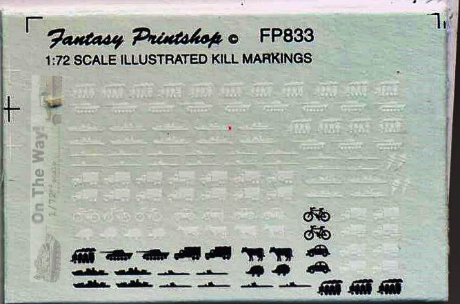 | FP883 | Kill Markings | 1/72 & 1/48. Includes locomotives, tanks, trucks, cars, ships, subs, ... bicycles, ... cows, ... and ... hedgehogs... both in white and in black. (It appears some white ice cream cones are also given.) | Picture |