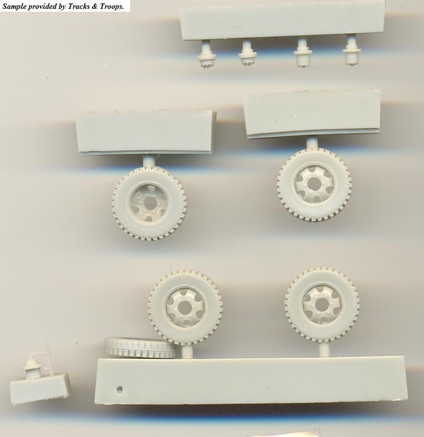 here.), which have very poor wheels. There were many types of tyres used on this type of utility vehicle, but these accurately represent the details of one type of them. (I wasn't able to verify the diameter, however.) In all honesty, the detail and casting quality on these tyres and hubs is the best I have seen from any manufacturer in Braille scale (and I swear, it is not because we got these as samples !). Detail is present on the inside and outside and the fine thread pattern is only marred by a small casting block attachment (which would be hidden where it touches the ground). 4 identical wheels are provided and a slightly different one to be used as a spare wheel. Separate hubs are also provided, with a different one for the spare wheel. I don't have the AMC/Profiline kits to check out how they fit, but looking at the pictures of the AMC/Profiline wheels (see here or here.) these are a huge improvement. - R. Haelterman |