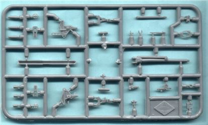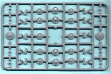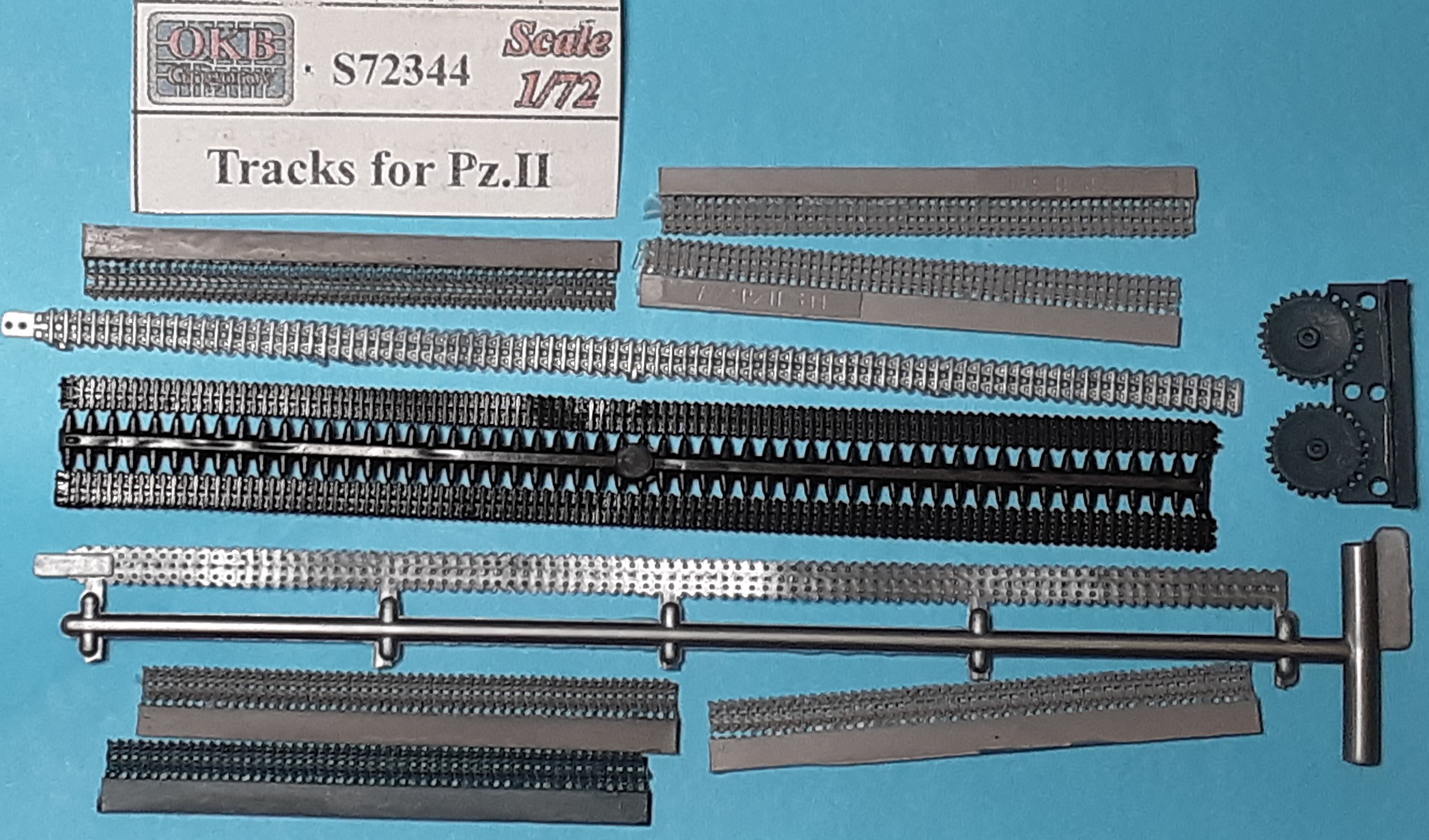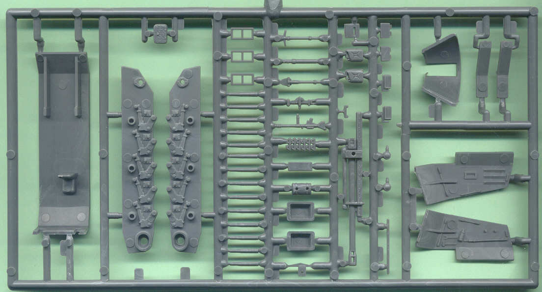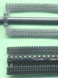 Parts Photos of the sprue above and below show the sharp molding of the ESCI/Italeri model kit despite its 20+ year old molds. Note that the driver’s hatch may be modeled open. The leaf spring suspension is molded onto the lower hull sides (parts-3 and 4). Top center are the howitzer carriage parts-75 & 76. Bottom center is one of the two crew figures; the 2nd crew figure is missing from the sprue, so see the sprue photos at Henk of Holland website (https://henk.fox3000.com/italeri/7061/09.jpg) to see the complete sprue. Be aware that the gun rounds (parts 5 thru 18) in the center of the sprue below don’t look to be correct for a 10.5-cm leFH18, as these look more like the 7.5-cm fixed rounds used in the StuK 40 and KwK 40 guns used in the StuG III and Pz IV respectively. The muzzle brake for the ESCI kit howitzer (part 33) may be drilled out to improve detail (no slide molding for this 30-year old kit?). The ACE Models Wespe model is similar to the ESCI/Italeri parts and how they go together; a main difference is the increased number of parts for the leFH18 howitzer and the suspension being separate parts and not molded onto the hull side. In the sprue photo below, we see the correct size 10.5-cm howitzer shells and cases (parts 70 & 71) at far left. The howitzer muzzle brake is in two parts so we should not have to drill out the muzzle. The ACE Models 10.5-cm leFH18 includes a gunsight (part-52) and more realistic shells and shell cases (parts 70 and 71) that are missing from the ESCI/Italeri model kit. The ACE Wespe model includes a greater number of interior parts and superior detail shown in the sprue above. The sprue of the ACE kit wheels below is the same as in ACE Panzer II model kits. ACE gives us two choices of idler wheels (parts 18 or 19), and separate right-side and left-side leaf spring bogies (parts 15 & 16). The separate bogies allow to more easily change them to model the roadwheels over irregular ground. The flexible black plastic band track from the ACE kit eclipses the stiff silver color polyethylene plastic track in my ESCI kit. The ACE track can be joined with super glue and I have read that the track should be painted with primer to curb a bad reaction with the styrene plastic wheels. I recommend the ESCI track be softened in hot water to bend it around the wheels, then use special super glue with a tube of activator to fasten the polyethylene plastic track ends together and to affix the track to the wheels. To significantly improve either the ESCI or the ACE Wespe of Pz II smallscale model I recommend the aftermarket cast resin tracks and wheels from OKB Grigorov, shown at the top of this photo, or from other aftermarket suppliers. Lower right is the ESCI/Italeri track. (At lower left is the Attack Models Pz II kit styrene band track, wheels and leaf spring bogies for comparison.)