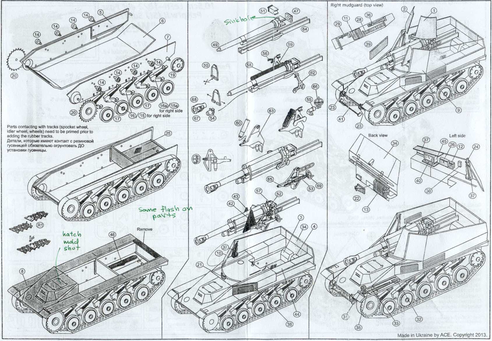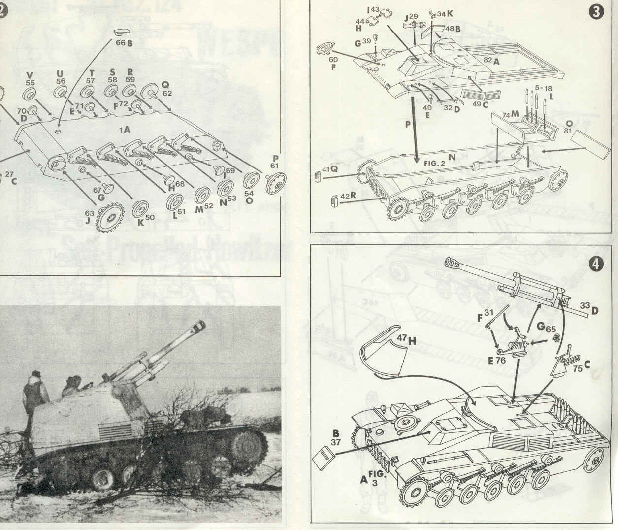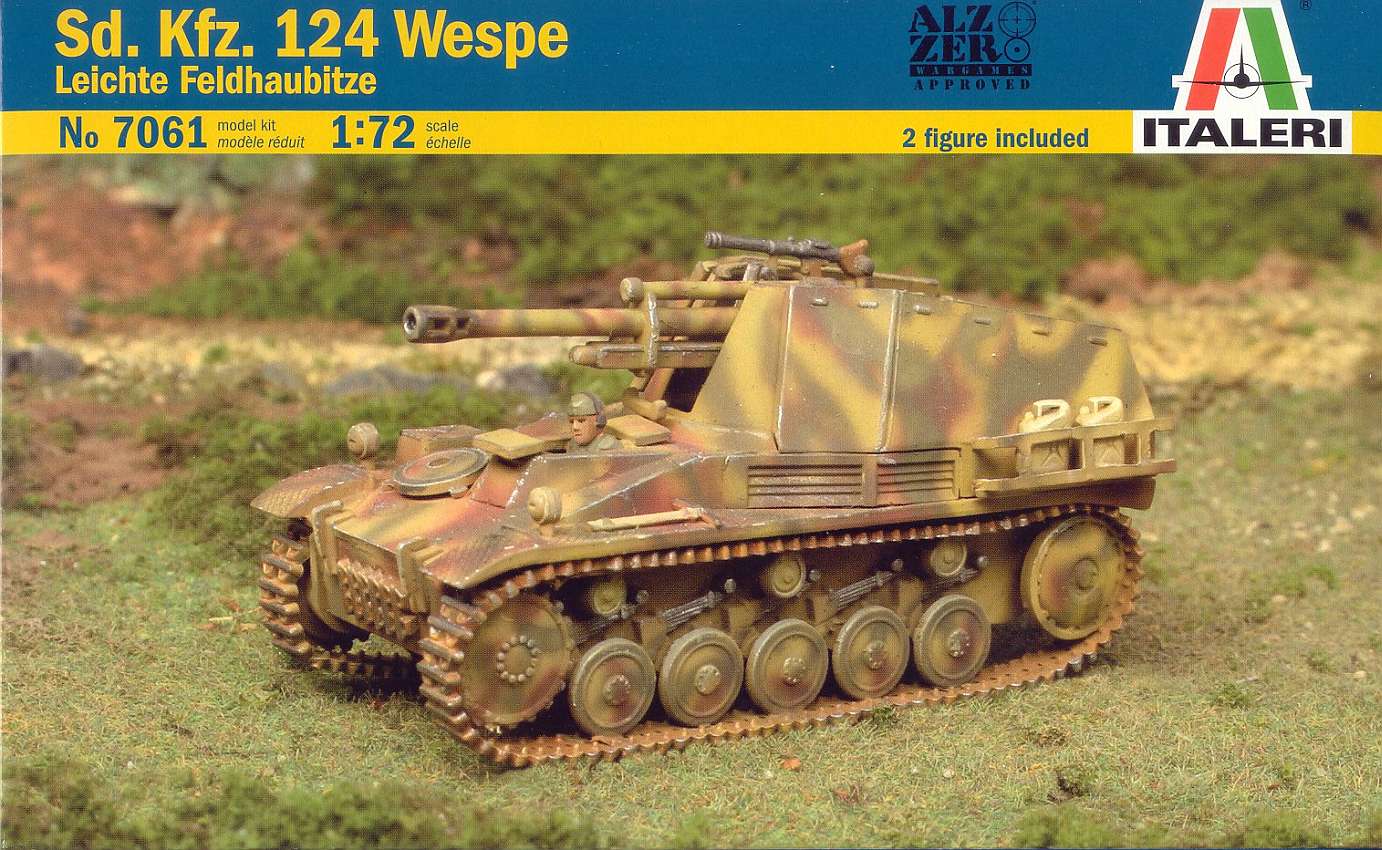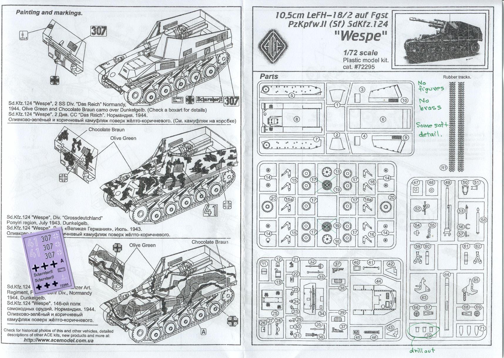 by Italeri. The boxart for the Italeri 1/72-scale Wespe model kit 7061 shows a photo of the actual competently built and handsomely painted model. From the top we see the open superstructure resembling that used by the Marder Panzerjäger series. On the glacis is a spare roadwheel which is a standard location for the spare wheel on the Pz II. At the rear of the port side visible here is a storage rack that is not typical for the Wespe. From the drape of the track over the wheels and lack of track guide teeth, this appears to be the dreadful stiff polyethylene plastic track common to many old ESCI model kits; note the lack of track sag. One of two crew figures is visible in the driver’s hatch. Italeri finished the model with a nice 3-color soft edge camouflage. The only markings are some unit emblems at the portside rear. The builder appears to have drilled out the muzzle. Boxart for ESCI kit 8004 shows an accurate representation of a Wespe in what looks like a cold day, and with a Nebelwerfer barrage launching at the far-left background. At the rear portside corner we see the storage rack made from narrower metal strapping than the model kit represents. The vehicle is finished in what appears to be dark gray with a winter whitewash. Markings are a red vehicle number and a white helmet marking indicating this Wespe is with the Panzergrenadier Division "Großdeutschland” on the Eastern Front. The boxart for the 1/72-scale ACE Wespe kit 72295 shows the same port side as the above two boxart. The artwork looks accurate and the paint scheme and markings very well done. This is a good view of the wheels and leaf-spring suspension. I am curious if the leaf-springs were actually painted black. Note the engine vents here on the port side under the gun mount. The rear of the Italeri box shows a color painting guide with 3-view drawings of three different Wespe vehicles. The paint scheme and markings of these three Wespe do not match the vehicle on the front of the Italeri or the ESCI boxes. Since the Wespe was in production from early 1943 we can find it in dark gray, or in panzer yellow and camouflage colors. Kit