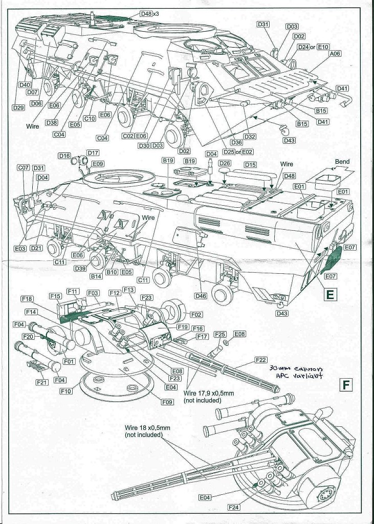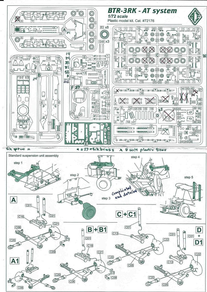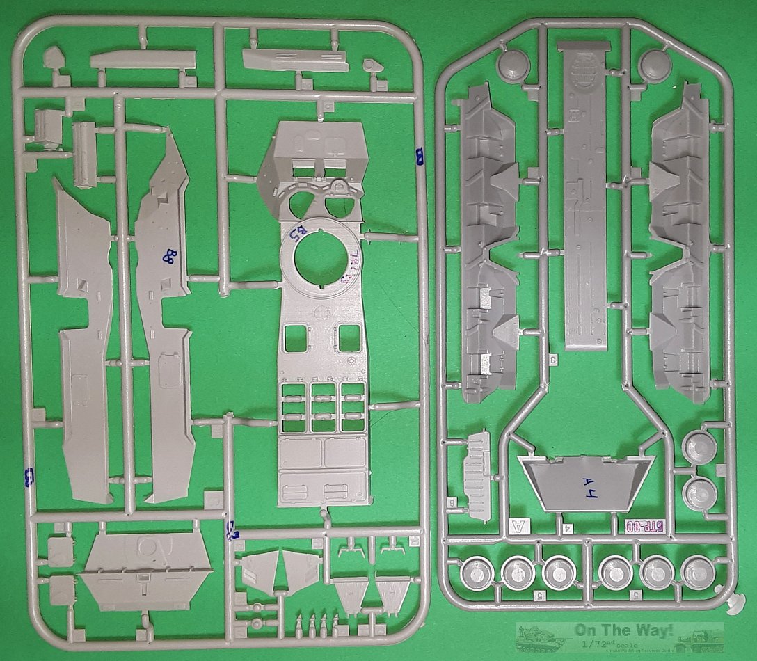 sprue-F from kit 72176 for the BTR-3xx tank destroyer variant. At right is sprue-F from BTR-3E1 kit 72175 for the APC variant. Extra, unused parts are crossed