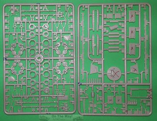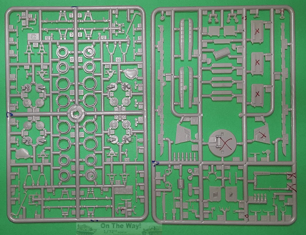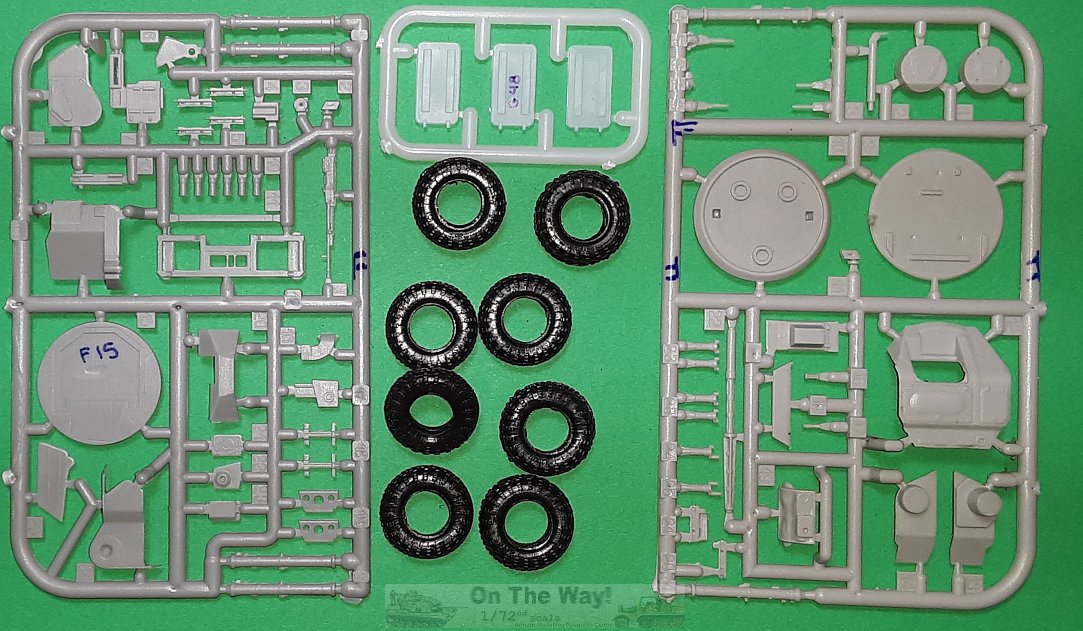 Above in center are the eight soft plastic tires, and the engine vent hatches on sprue-G, common to both kits. At left is the