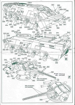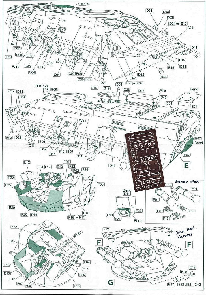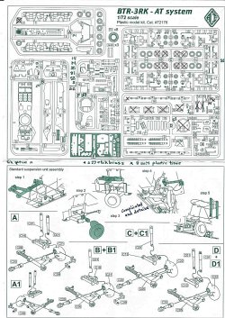 Reflecting the large number of kit parts, the exploded-view assembly instructions are very detailed and, in my opinion, very complicated; this is not a quick-build beginner's model kit. The above view of the suspension sub-assemblies is a good example of the complexity. The only real negative I will express is that ACE prints their assembly instructions in a less readable Kelly-green ink (I have darkened the scans to better show the details). Assembly of the hull and suspension is basically the same for the two model kits but the turrets differ greatly. Immediately below we see assembly of the APC turret for kit 72175 while at bottom is the turret for the tank destroyer variant kit 72176. The etched metal fret is for kit 72176 and differs from the fret in kit 72175. The scan below displays painting and marking instructions and the two water-slide decal sheets that come with each model kit.