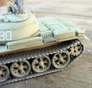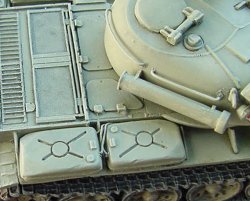 I painted the model in AeroMaster acrylic paints. The markings in the kit are very well printed, and from prior experience, are very good decals. But I wanted to take this opportunity to review a second product at the same time, so I chose to use some decals from YnoT instead. The markings I used represent a Polish T-55 of an unknown unit in the mid-1970's. But I think I may have made a mistake in my choice of markings. After completing the model, I've seen that Polish-built T-55's had a storage box on the left front face of the turret, with the vehicle number on top of the box. I didn't take the time to replicate this box, and put the number right on the turret face, but I think that perhaps ALL Polish tanks had this box, so my markings may therefore be wrong. Additionally, I don't know if Polish T-55's had the snorkel stowed on the right side of the turret, so again, the inclusion of this part may be incorrect for a Polish tank. Regarding the scale of the kit, according to my references, it as exactly 1/72nd.