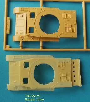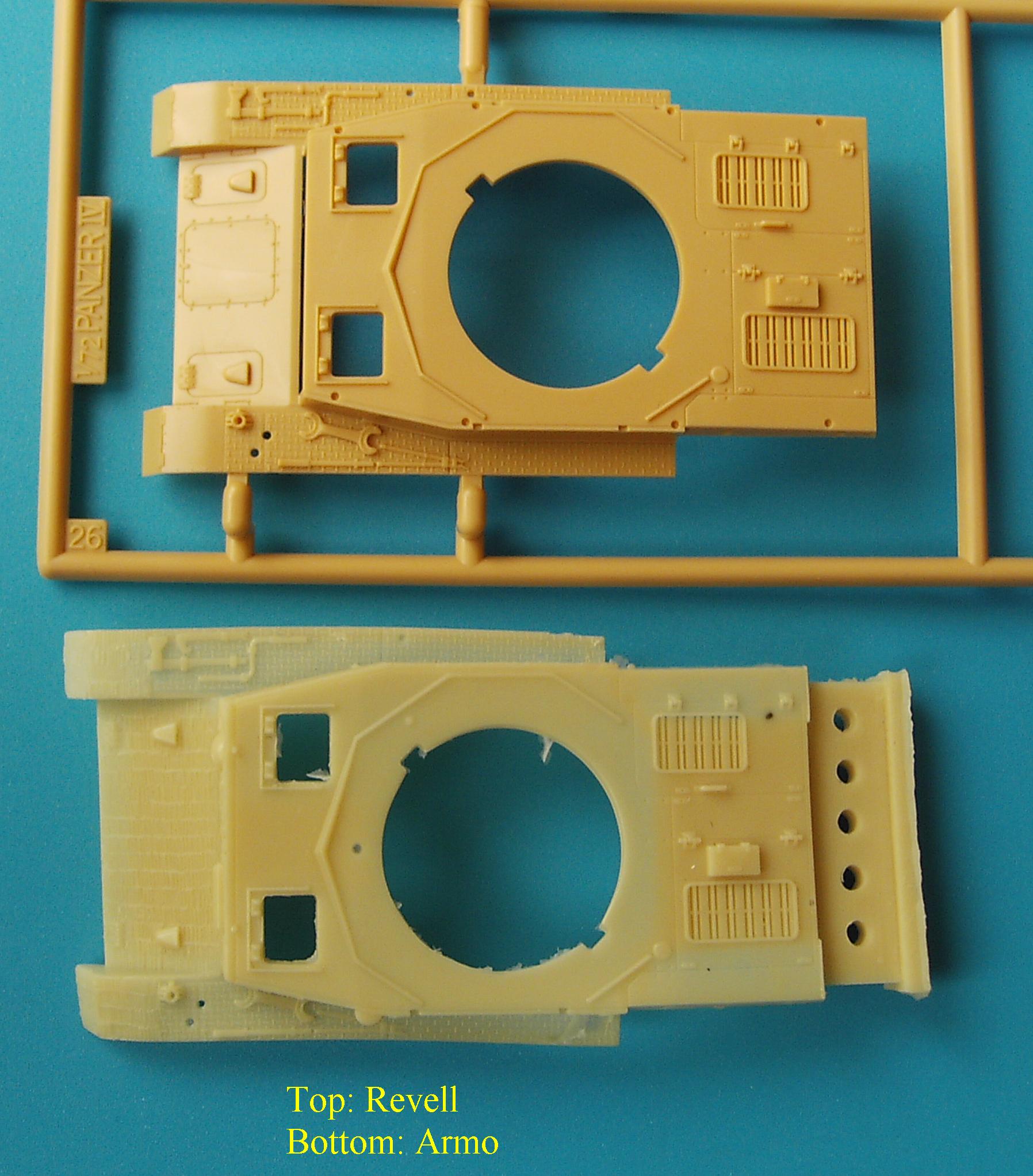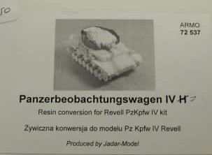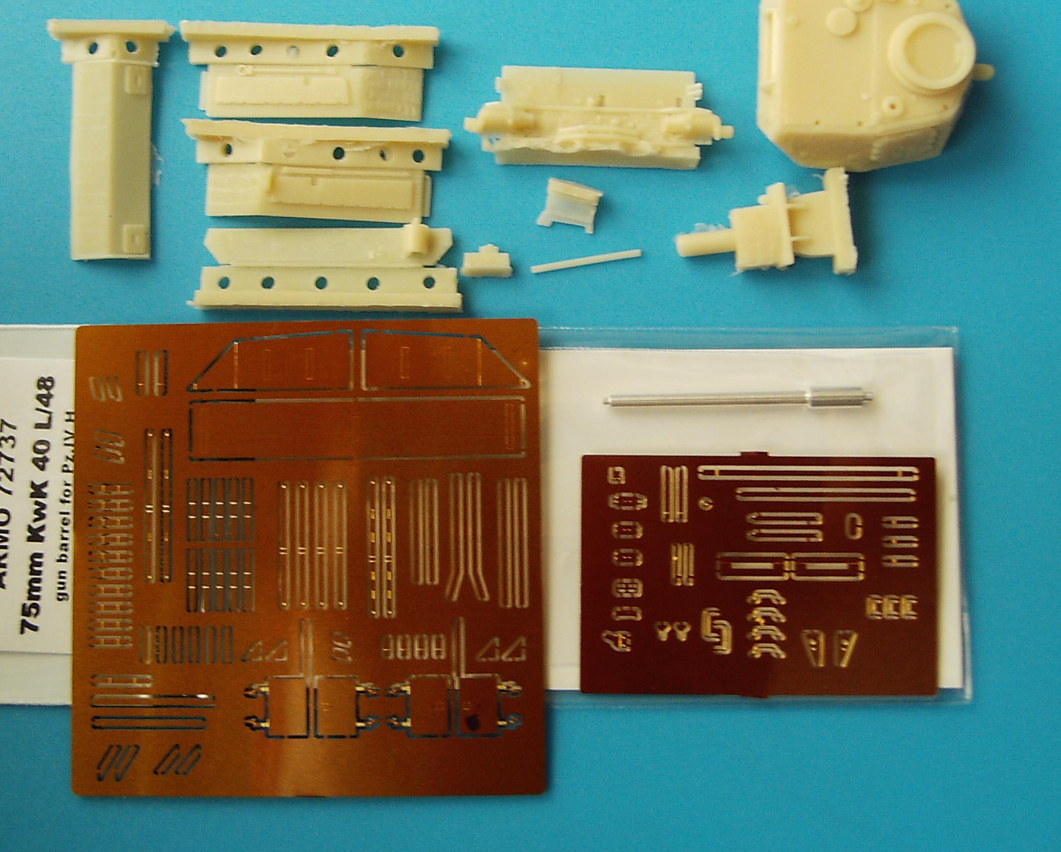 This is a true multi-media kit: it includes resin parts, photo etched brass, turned brass and turned aluminium, all packed in a cardboard box and complete with a nice instruction sheet with pictures (in black and white) of the completed model. But first of all, do not be surprised. This kit does NOT represent the Panzerbeobachtungswagen IV Ausf H, but the Ausf J. Why ? Because, it does not have the muffler for the auxiliary engine on the back (the transverse mechanism for the turret of the Ausf J was by hand, while in the H it was powered). So what do we get ? 1. Resin parts for hull (basically everything except the bottom plate). The upper hull was badly warped in my specimen, but Armo actually tells you in the manual that this is to be expected and how it is to be solved. Still, I am not sure whether it will work out for this large piece. These (and most other) parts are copies of the corresponding Revell parts (with some small parts already fixed to it), but with a very fine Zimmerit pattern added to it (see pictures). It also has the housing for the additional antenna on the right of the rear plate. Strangely enough, the bogies on the port side are all tilted, as if the tank was driving on a washboard. The starboard side has the axles on the same level. Rear fenders with Zimmerit. Turret. This is a one piece casting, apart from the mantlet. It also has Zimmeritt applied to it, and the necessary modifications to the roof for a Beob.Wg. All hatches are moulded closed. The small rod is supposed to represent the observation periscope. Mantlet and gun housing with Zimmerit. Some small parts that I haven't been able to place yet.