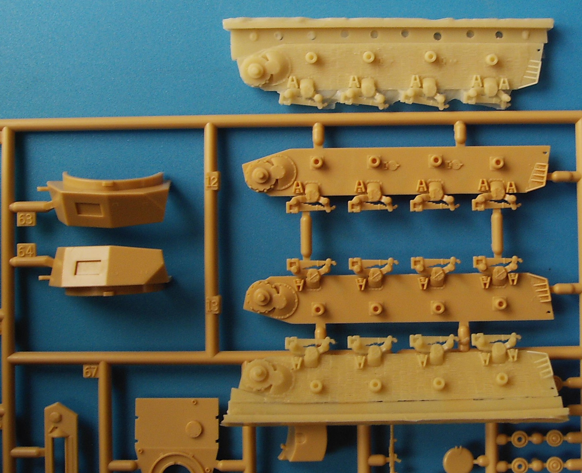 So what production model is it then ? The Zimmeritt squarely puts it into the September '43 – September '44 bracket. OK, I know, the Ausf J only entered production in February '44, but you never know you want to backdate it to an Ausf H. In that case, take into account that a single prototype of the Pz.Beob.Wg. IV was built in January 1944, and it only entered series production in April 1944, when the Ausf J was already installed on the production lines. Now, a number of overhauled Panzer IV's were rebuilt as Beob.Wg. so it is possible. It still has the old style of side armor plate, without the tow eyes in the extended sides, and four return rollers which makes it a pre-October 1944 model. (The four return rollers make it a pre-December 1944 model anyway.) The turret has Pilzen for the jib crane. These were introduced in June '44, but were also retrofitted. You are going to use the welded idler of the Revell kit, which was partially replaced by the cast idler in October 1942, and the horizontal muffler which was also partially replaced with the vertical Flammentöter exhausts in August 1944. It has no pistol ports or vision ports in the turret doors, and the vertical rectangular filler cap for the radiator (on the engine deck), so it should be post April '44.