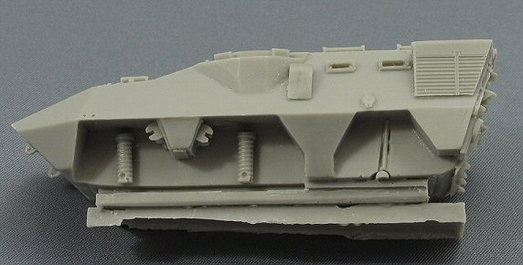 The Pandur hull is a complicated multi-angle affair, which Armada Hobby has succeeded in reproducing correctly. I checked the dimensions against a real (Belgian) vehicle and apart from the lower crew compartment, everything was within my tolerance range. The hull is cast in one massive piece, which will make the finished model rather heavy. All hatches and doors are moulded shut, which is a pity. The prominent anti slip texture, present on the horizontal surfaces of the real vehicle, has not been represented. The pistol ports are missing on both sides. This however can easily be added. The air-condition box (the big square box on the rear part of the left side) is very nicely reproduced. There should be a similar, but smaller box on the right side; this one however is missing. |