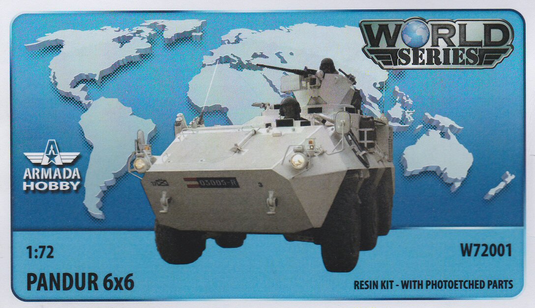 Armada Hobby recently released in kit form four versions of the Pandur I family, a 6x6 light armoured vehicle manufactured in Austria in the nineties. Used by Austria, Slovenia (where it’s called the Valuk), Belgium, Kuwait and the US Special Forces, this family, being C-130 air transportable, has seen widespread use in UN and NATO missions and is therefore a welcome addition for fans of modern stuff. The base version of the family is a HMG armed infantry carrier. These are supported by specialised variants, like ambulances, command post, mortar carrier and maintenance vehicles. The Kuwaiti National Guard also uses a number of turreted versions; one variant having a 25mm M242 Chain Gun, the heavier brother of the family being armed with a Cockerill 90mm gun. Some years ago, Belgium even went one step further and converted its family into reconnaissance vehicles by installing a day/night observation pod on a retractable mast in the rear compartment. The kit arrived, packed in a sturdy cardboard box, but inside, the zip lock bags containing the resin parts, could move freely. As a result, some small parts, like axles and pins, had been broken off from their pouring blocks. But