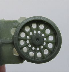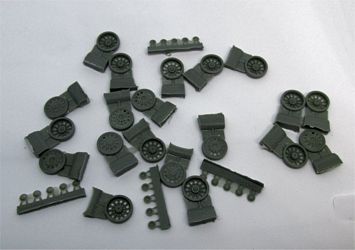 | Early T-54 versions mounted a type of roadwheels generally nicknamed "spider-type", because they resembled a cobweb: they had 12 reinforcing ribs, 12 large lightening holes and 12 small lightening holes closer to wheel hub. The tyre was solid rubber without any perforations on the side. the T-54 road wheels were extremely similar to those mounted on late T-34/85, so that most people think they were the same. On the contrary, T-54 spider wheels are smaller in diameter and larger in width, although I doubt these small differences would be visible in 1/72nd scale. Starting from T-54b, "spider-type" wheels were replaced with the "starfish-type" wheels, which had to become so characteristic of the whole T-55/T-62 family, and older models had their wheels replaced with the newer ones when back for repair. However, it was not very rare to see a T-55 or T-62 with a mix of "spider" and "starfish" wheels, as the older wheels were seldom used as "on-field" replacements. The parts are very well cast, with discrete sprue gates and a good amount of flash, which would force the modeller to clean every single hole (there are 240 !). Hubs are provided separately and they have the correct number of bolts. The instruction leaflet is quite useless because it is not hard to understand how to assemble the wheels.