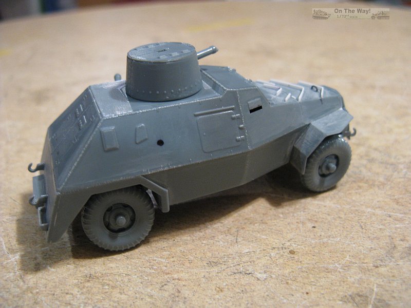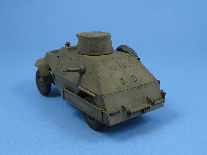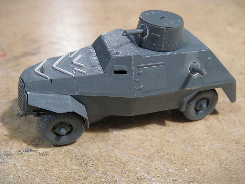 wheels touched the ground. The bracket on the rear hull and the tow rings have been added. The small black dot is where I figure the spare tire will be mounted. The
