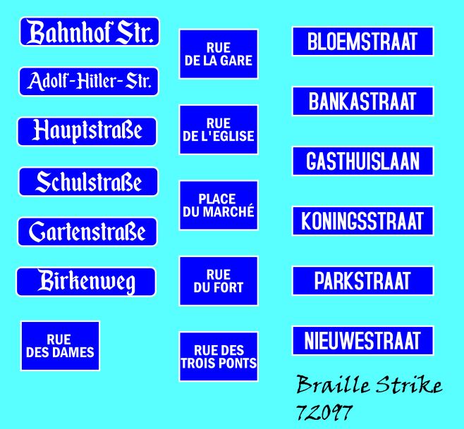 This set covers a number of street signs in German, French and Dutch, without indicating to which area they would best be suited, as I can imagine that the design varied from country to country and, perhaps, even from region to region. (The three languages present on this sheet might, for instance work for France, Belgium, the Netherlands, Germany and Austria.) Looking
