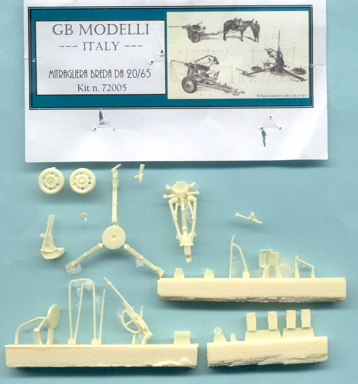 Instructions The 2nd page of GB Modelli's instructions portray the gun deployed, and mounted on a truck bed without the tripod legs, and being towed by a mule or donkey; the donkey and crew figure are not included in the model. After assembly I believe that while serving in North Africa the weapon would be finished in gunmetal and desert tan. The gun in Italy, the Balkans and Russia would be colored gunmetal and gray-green color. |