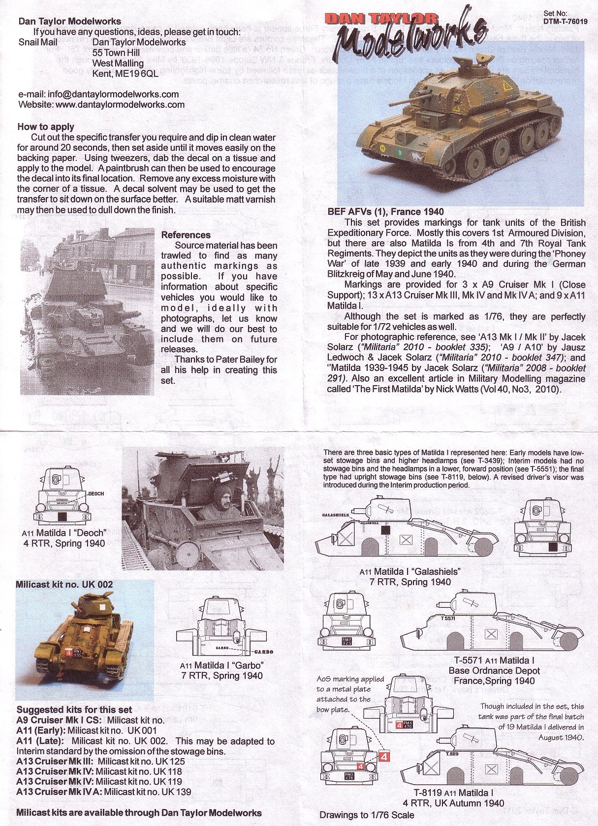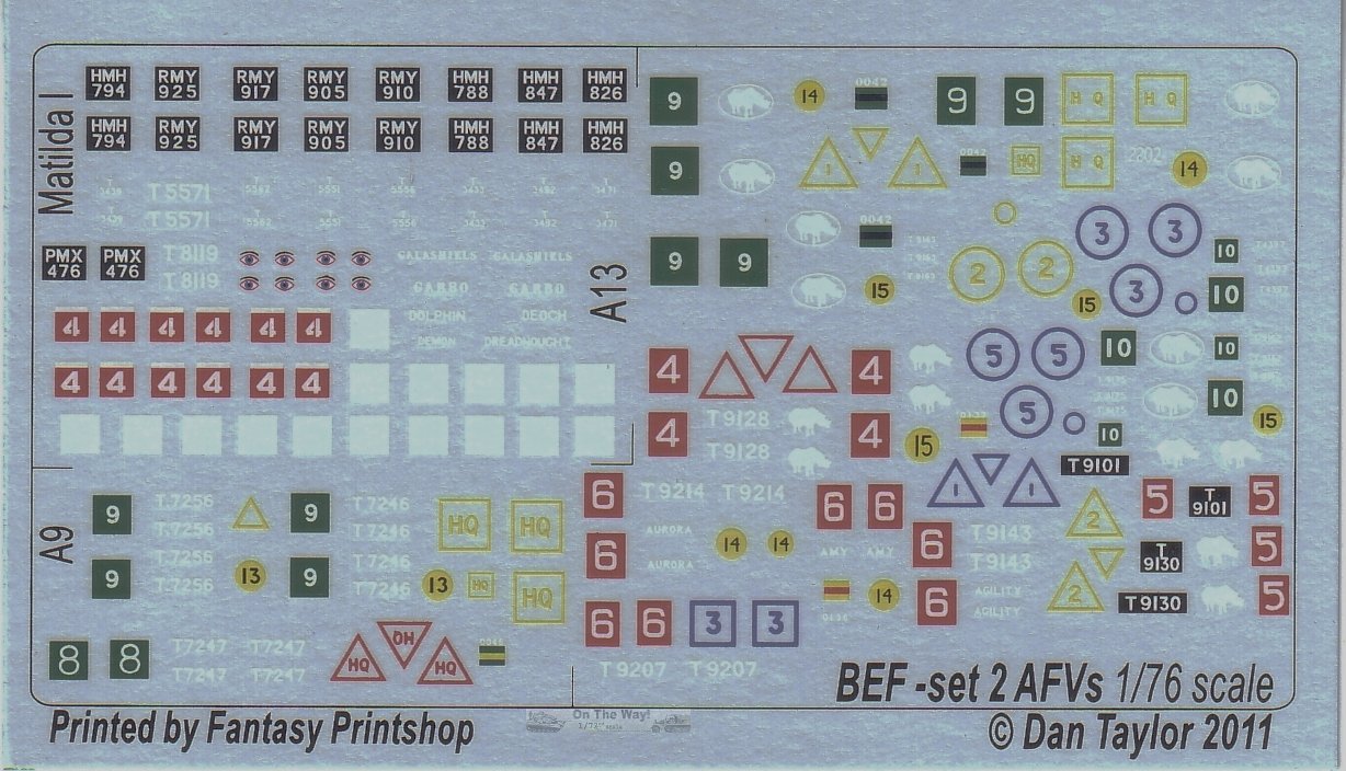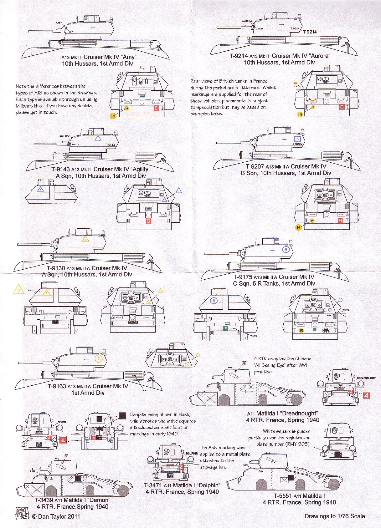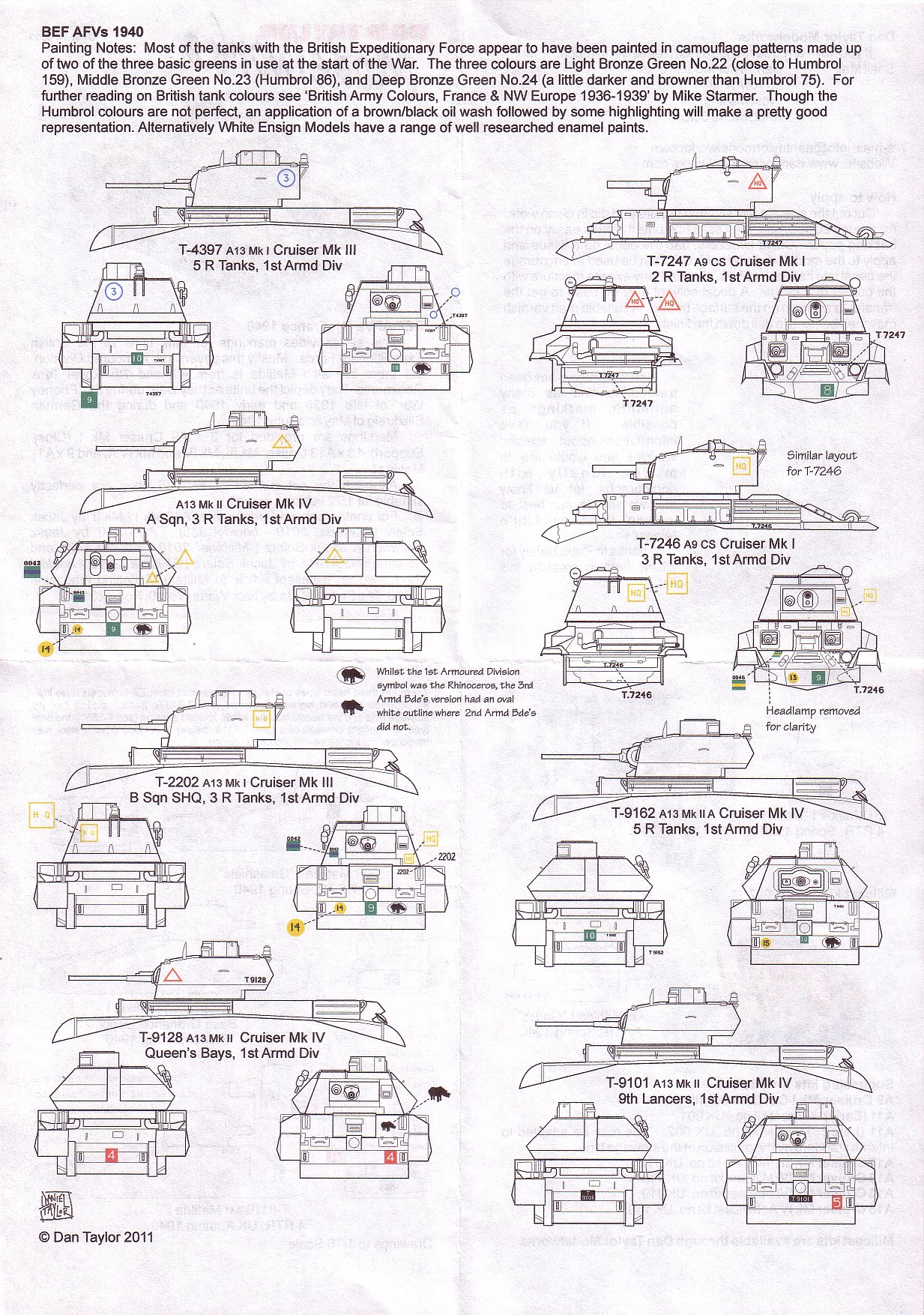 To quote the preamble from Dan Taylor Modelworks: "This set provides markings for tank units of the British Expeditionary Force. Mostly this covers 1st Armoured Division,