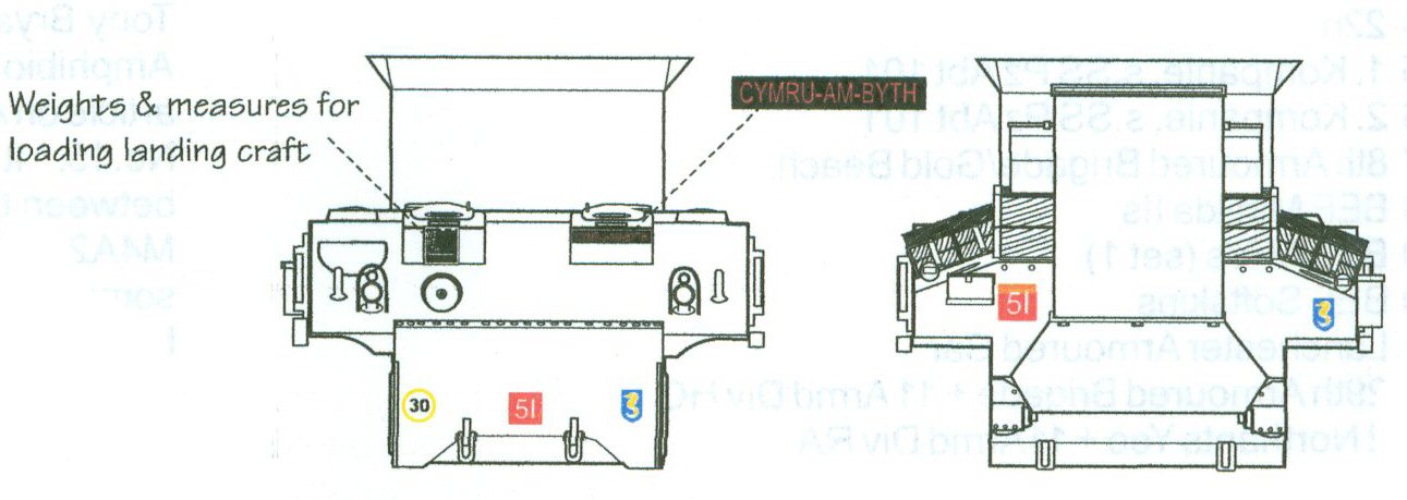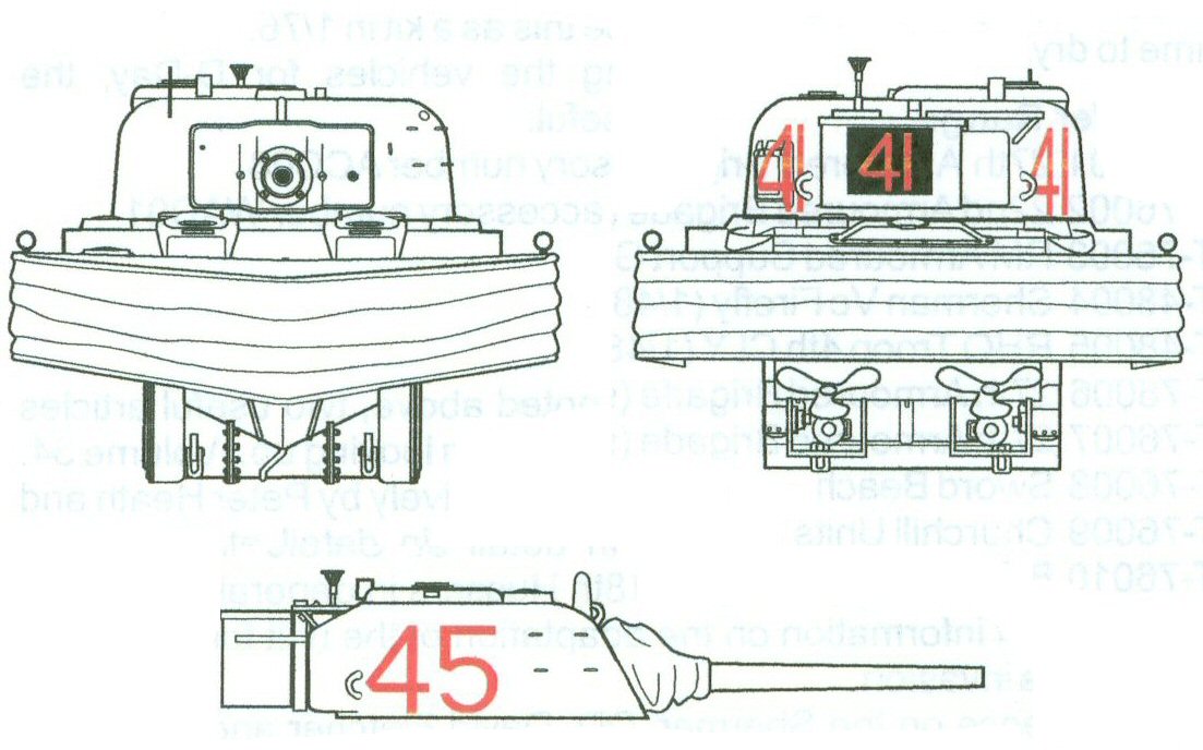 Mk III ARV CYMRU-AM-BYTH A turret less Fisher tank, it had the squared welded hoods, the cast rounded transmission cover and the “D” type antenna bracket. The tracks were the rubber T41 or T51 flat type. A well known photographic sequence shows CYMRU-AM-BYTH allocated to the LCT 610, aka 212, for the D-Day landing. I don’t have a photo which shows the LCT number; anyway it should have one of the variations described below. |
