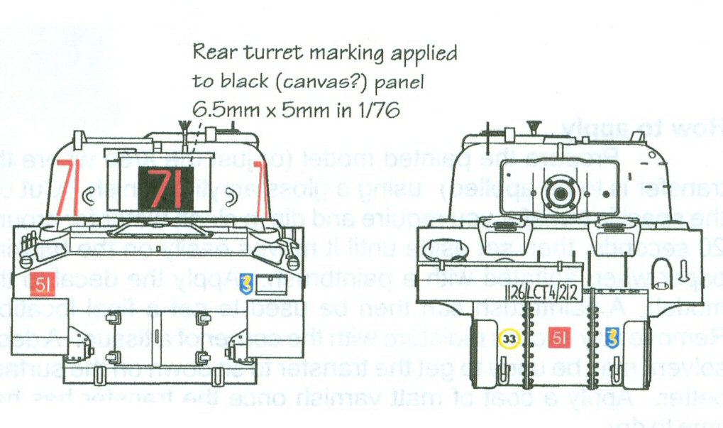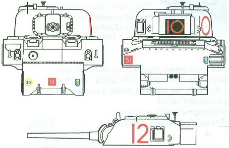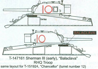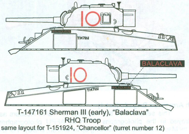 Mk III T151924 “12” CHANCELLOR Sadly I don’t have a photo of “12” in Normandy. The only 13/18H “12” I’ve seen is with the 8th AB near Nijmegen in October 1944 (IWM B 10996). The font and the colour of the October numbers are different from the ones of the 27th AB time, while, logically, the Brigade marking and the AoS number also changed (and the HQ diamond is not red). Having taken the place of the 24 Lancers, I suppose the colour is yellow. Anyway the typical stowage arrangement hasn't been altered, nor the way to paint the name and the HQ marking on the hull side. I don’t know if this tank is the same D-Day veteran “12”, anyway the October tank had the bolted transmission cover and the cast hoods. The gun mount is the late M34 type. The tracks were the metallic T54E1 type. The name was TWELFTH KNIGHT, which is also given in the set (the WD number seems to be missing on the original tank too).