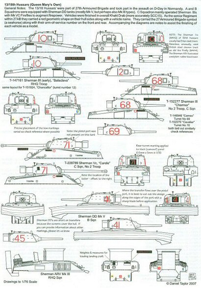 The set is dedicated to the 13/18 Hussars, a very well known unit which fought in Normandy within the 27th Armoured Brigade until the disbandment of this Brigade. At the end of July, they went over to the 8th Armoured Brigade to relieve the 24th Lancers. Some photos about C Squadron tanks, taken just before the D-Day, are well known while images of the Mk V DD, which equipped the A and B Squadrons, are less common.