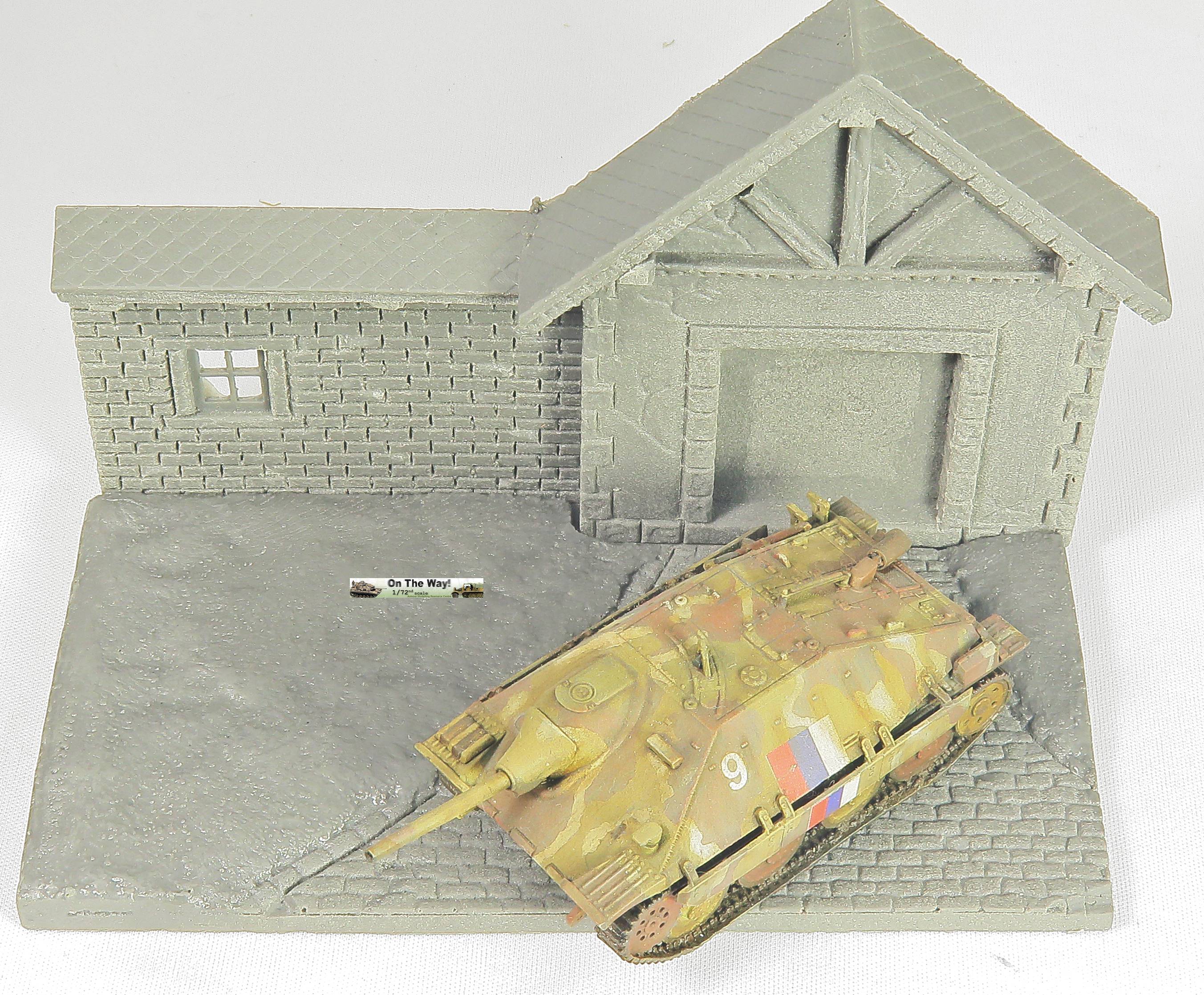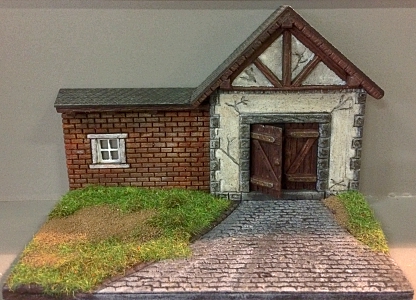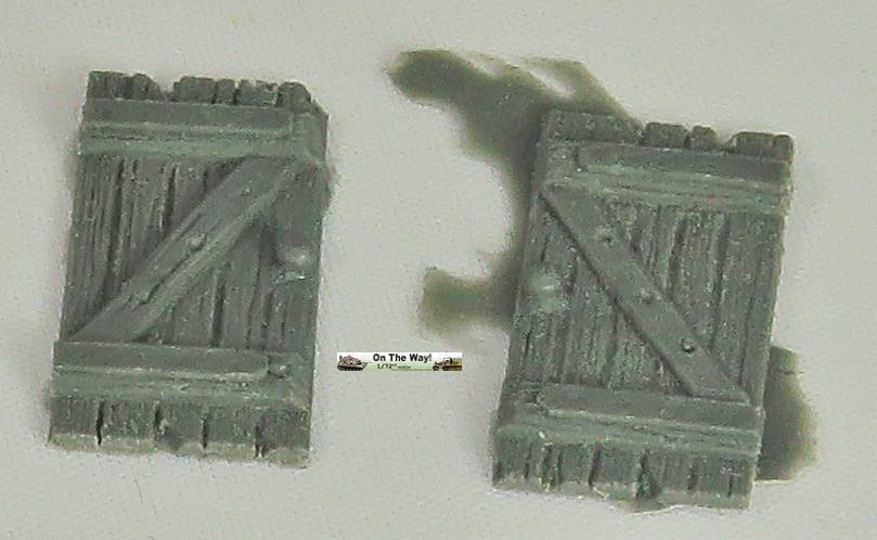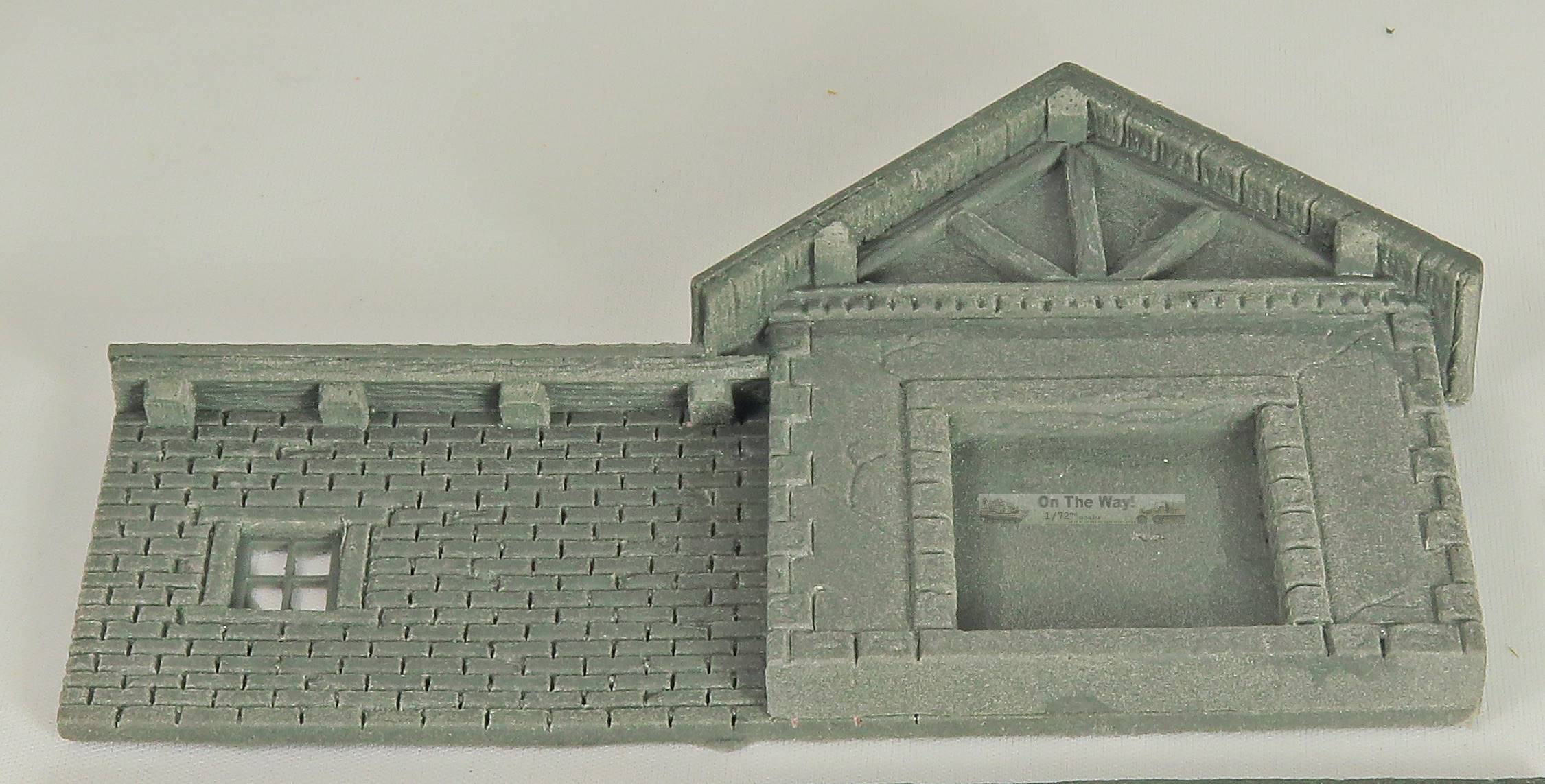 This set represents the front wall of a barn with mixed construction (timber frame and bricks) which would be typical for central Europe. Inside the sturdy cardboard box you will find two main parts of resin and two smaller parts for the doors. Despite the size of the parts, casting is as good as perfect, with some minor flash to be cleaned up.
