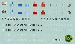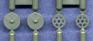 Can't see them? They're the ones on the left, though you wouldn't know it. There are no sprocket teeth, and no hub detail whatsoever. Granted, it should be easy enough to add a few bolts around the center hub, and also a couple of tiny teeth, but we really shouldn't have to. It seems like a lot of effort went into providing this model with outstanding details, so it is a surprise to see these wheels. Even the instruction sheet shows these wheels as they are supposed to look, with teeth and bolt detail, so it makes one wonder where the detail went. But aside from that, this is an awesome kit. The decal sheet adds to an already excellent model, with markings for numerous possible vehicles. There are color profiles printed on the back of the box giving the painting and marking information for three Italian tanks, though with the extra markings on the decal sheet, we can make many other options. The decals look very thin, and sharply printed.