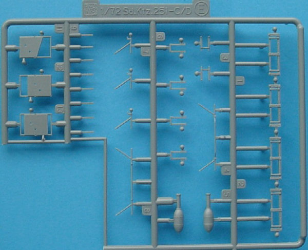 Until the release of this version I had successfully managed to resist buying any version of the Dragon Half tracks.This one was an exception, my excuse is that it isn't an APC but an Artillery vehicle despite there being a full and comprehensive interior included with the kit, with some of the nicest Kar 98's I have seen for a long time and it seems a waste to put them in the rack. The kit comes with some of the interlocking leaf wheels moulded together, some won't like this and would prefer separate wheels, however once the wheels have been assembled it is not noticeable even without the track fitted, once the track is fitted it can not be seen at all, the front wheels come with a fully detailed suspension. As far as I can work out the Rockets came in two sorts, the 32cm napalm rocket in a wooden frame and the 28cm HE rockets in a metal frame, the kit supplied frames seem to be the wooden type indicating that these are the napalm type rockets. One thing missing from the kit are the sighting vanes that were mounted on the front of the vehicle and these will have to be manufactured for an accurate kit. Often labeled as "Stuka zu Fuss"( "Walking Stuka" although Sqn Signal have translated it to "Stuka on Call" ) by some references, others call it "Bellowing Cow" or "Huelende Kuh" (I can be corrected on the translation) in German. Moulded in the now usual grey plastic that is slightly softer and easier to work with than the earlier lighter grey plastic used by Dragon. The Hull bottom is fully detailed. The Hull top and fenders, floor and seats for the interior, the Engine housing of the vehicle can be made open although no Interior/Engine is provided, this is one for the aftermarket boys. The main suspension parts plus various hull and interior fittings Two of these sprues are provided and contains the outer road wheels and the tyres along with weapons and tools There are 3 of these sprues in the box containing the rockets, frames and mounting brackets for the vehicle. The PE fret contains the number plates, various fittings for the interior and rear mud guards The other PE fret contains better detailed mounting brackets. The Decal sheet is comprehensive, but you have to make the number plates yourself, which theoretically means that you can make any vehicle, but might get a headache doing it. The Tracks are in DS styrene and nicely detailed, with them being DS it means that you can get them to sit on the wheel tops properly without trouble, also the links are small enough so that it is not noticeable that they are flexible. A highly detailed kit, I have never seen the Esci version of this vehicle so I can't compare it, but given the time between the release of the kits, I would imagine that this is miles a head of the old Esci kit. The kit measures out to 1/72 from the references I have. References SdKfz 251 in Action Sqn/Signal Publications SdKfz 251 Half-Track 1939-45 by Bruce Culver and Jim Laurier, Osprey New Vanguard 25 SdKfz 251 Militaria 012 Schuetzenpanzerwagen War horse of the Panzer Grenadiers by Horst Scheibert, Schiffer Military History Die Halbkettenfahrzeuge des Deutschen Heeres 1909-1945 by Walter J Spielberger Motorbuchverlag |